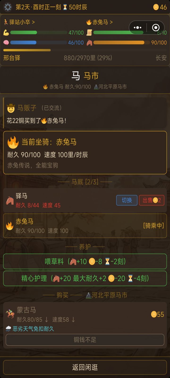 当中不知道怎么玩错过很多机缘,不过赌马运气好给了赤兔稳了
