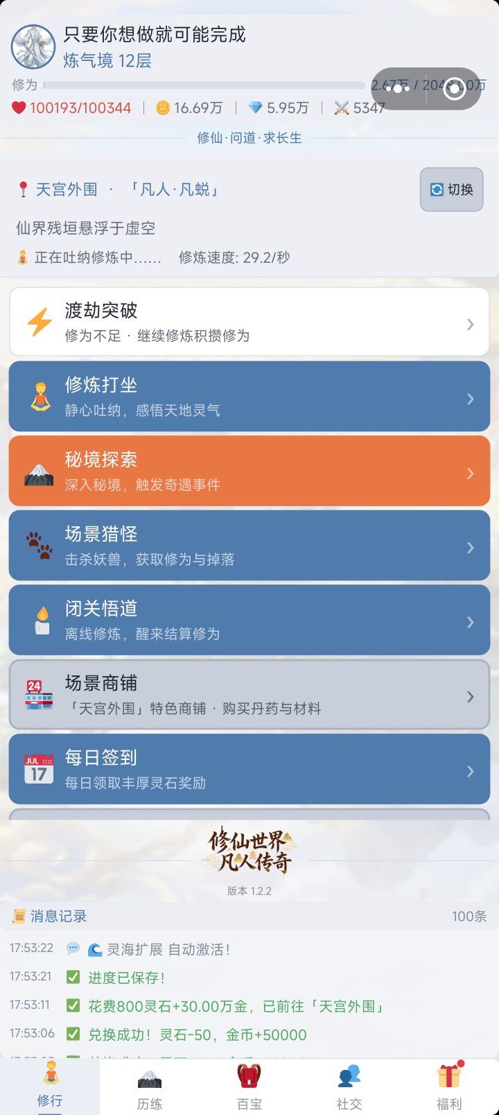 一朝仙缘降凡尘,半生苦修证长生!一款深耕东方修仙内核的文字放置养成大作,邀你化身被云游散修慧眼识珠的凡人少年,从村口劈柴的懵懂稚子起步,挣脱凡胎桎梏,踏过筑基、金丹、元婴、化神的重重天堑,历经千难万险,终破天道枷锁,渡劫飞升,走完一条独属于你的波澜壮阔修仙长生路。游戏以竖屏极简操作、沉浸式文字叙事为核心,融合境界修炼、秘境探索、炼丹锻造、道侣双修、规则怪谈、卡牌对战等十余种玩法系统,内容丰厚不单调
