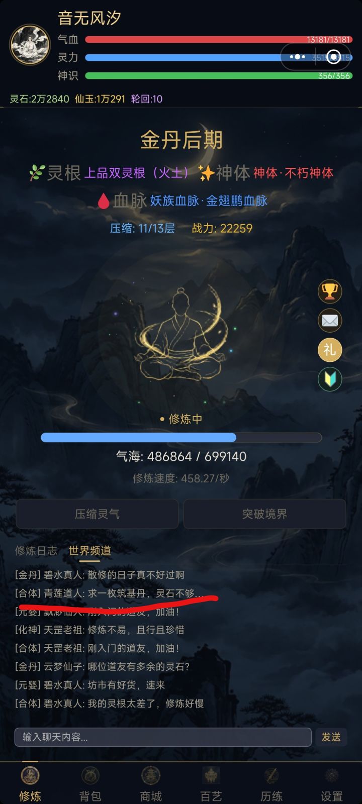 轮回之后 目前游戏里唯一个加修练值的练气决没有了,修炼那叫一个痛苦。上品灵根 /红仙/红血脉 聚灵阵6级 每秒才10多点的修炼速度 ,没轮回前练气诀满级,上品灵根/金仙/红血 聚灵阵3级每秒都有80多点修炼值。这修炼速度一个在天上 ,一个在地上,轮回之前简直就是坐牢,玩不动!!!