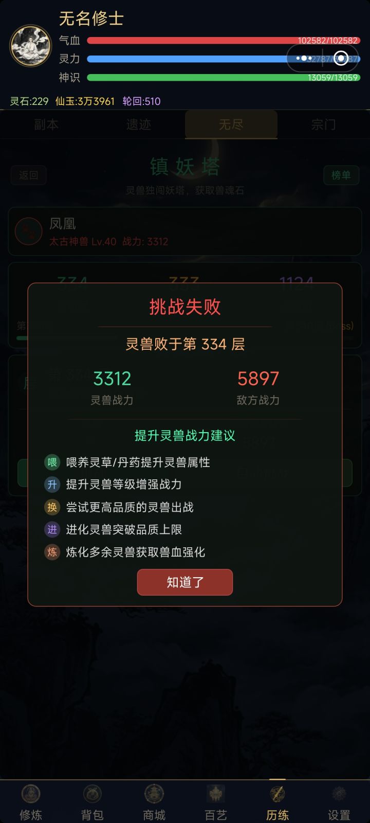 目前版本属性被吞,已经逃不了课了。攻击,神识不涨,剑阵打不出伤害。属性也叠不起来。直升飞升巅峰也打不过几百层,压缩几百万仙玉到炼虚也不过打到6000多层卡死。作者啥时候把压缩跟突破涨的属性修改回来。