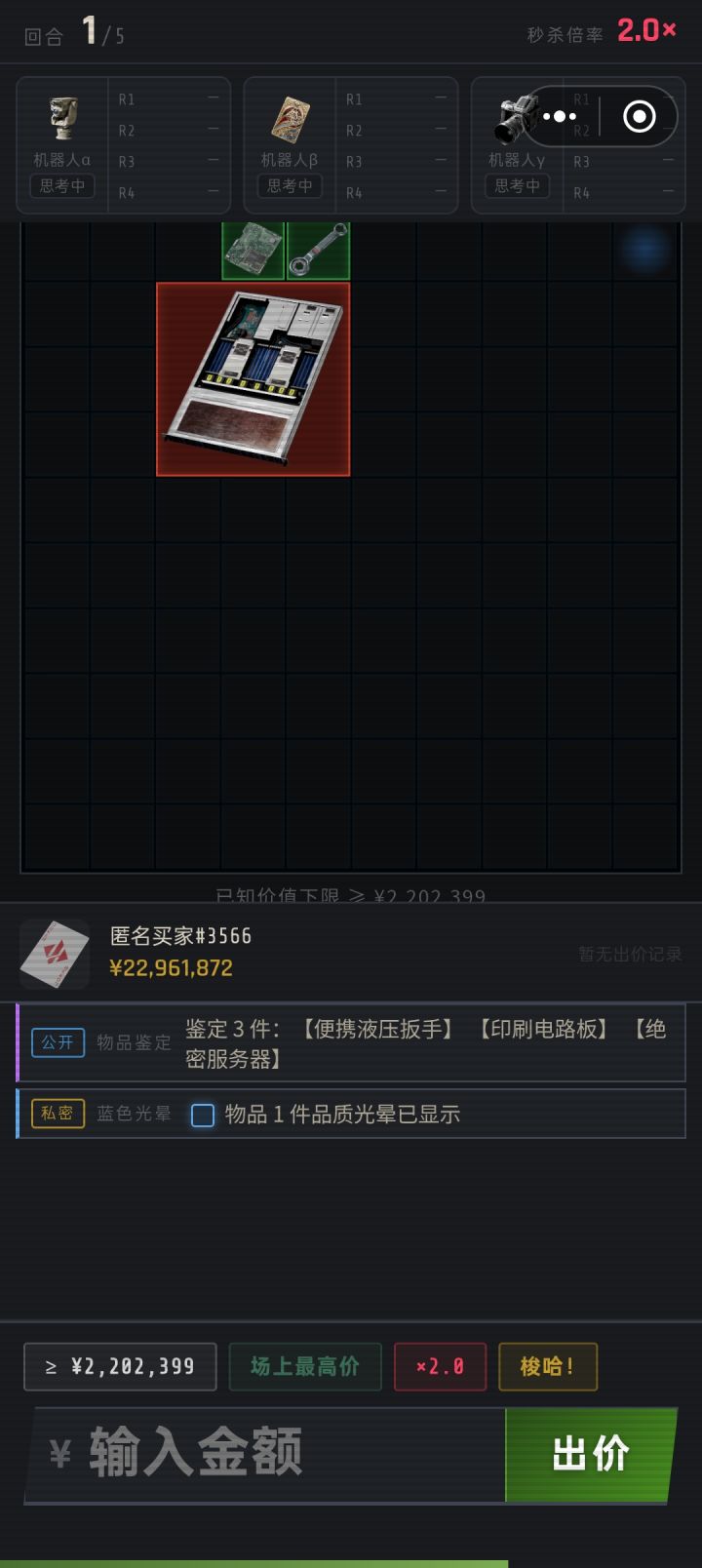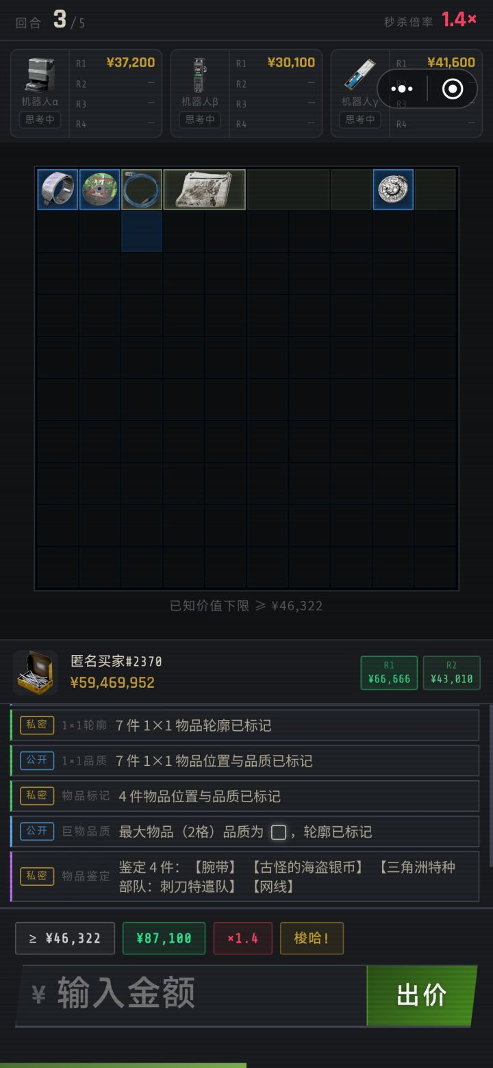 建议出一个入门费越高爆率也随之提高的门票机制,这游戏基本只能跟人机打,跟真人匹配上来就砸50w100w毫无心理搏斗可言,纯金钱压制,我这些钱都是人机局打出来的,没出过泪和心之类的的超级大红,而且这游戏人机如果出价高于总物资2倍以上疑似会自动弃牌