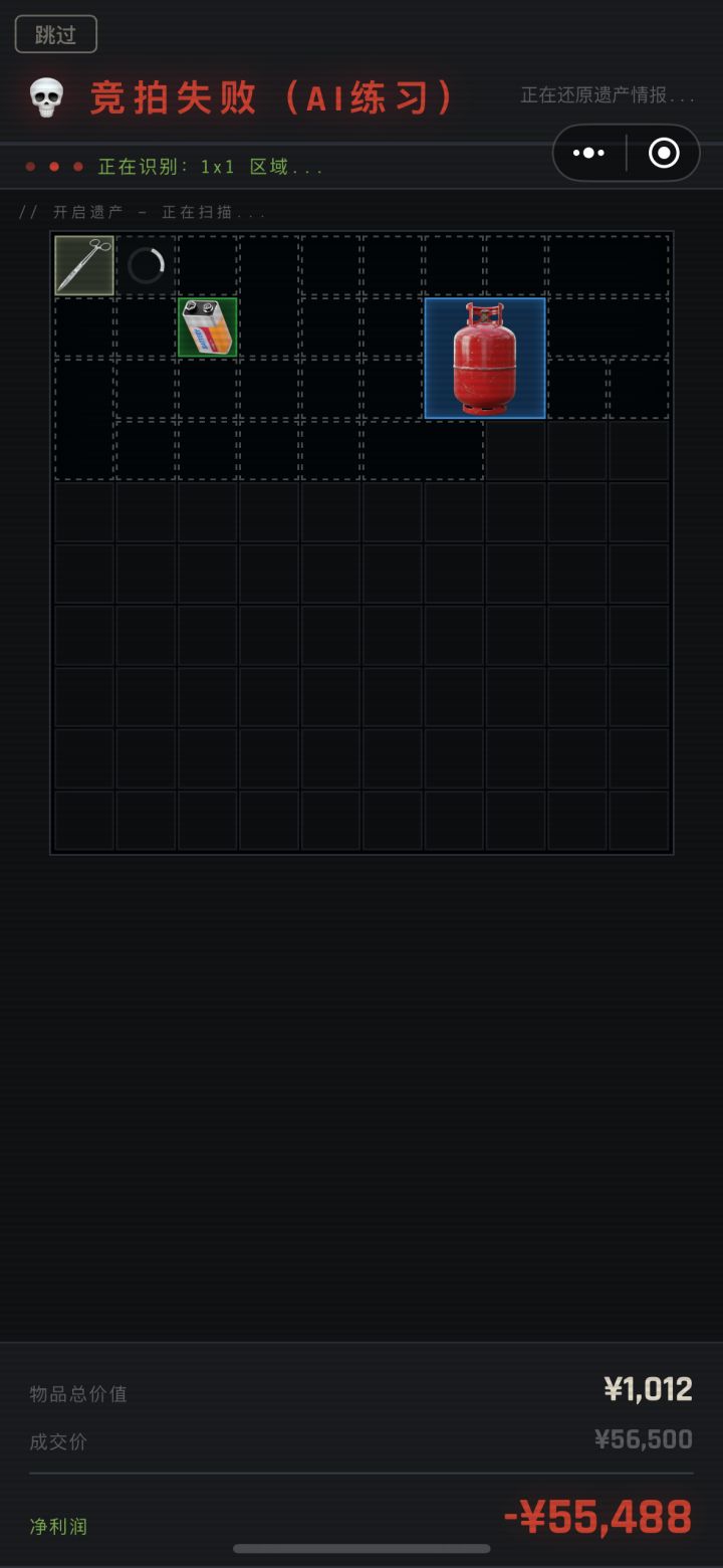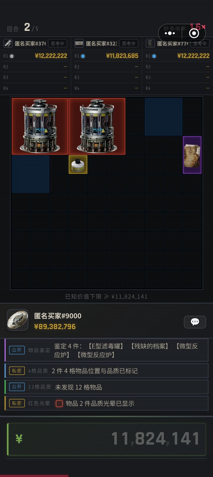 我开局运气好透到微型反应炉了所以直接上600w了,如果说1号出价还能理解,2号是因为透1格判断有最少6格9格赌一手,这3号白色的品质光晕是怎么直接自信上444w的虽然机密航天不算特别新手场,但这上的也太离谱了。
