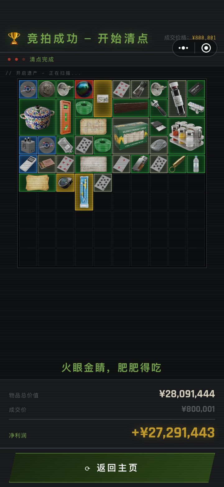 不是别人都退了,就正常拍卖我出了个小bug上面的出价条回不去了,我又在刷牙,就懒得算钱随便按的按着按着发现我用8块钱拍到了,点开一看竟然有500万,直接给我笑裂开了另外两个人互相标价,应该是都高出了自己心理价位(印象中是一百多万)好像是第三回合,俩人突然一起打了个0,我都不知道自己出没出价,仔细一看我出了个8...