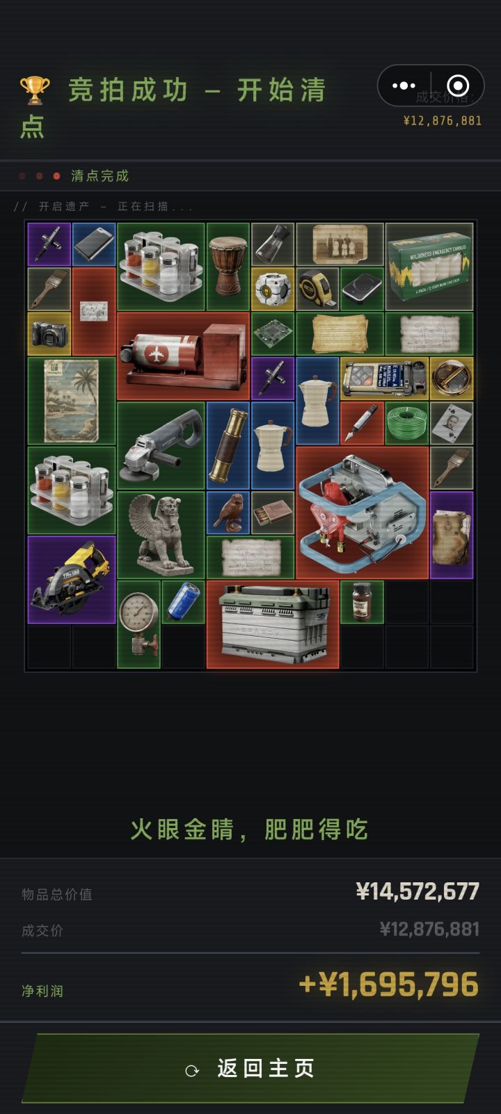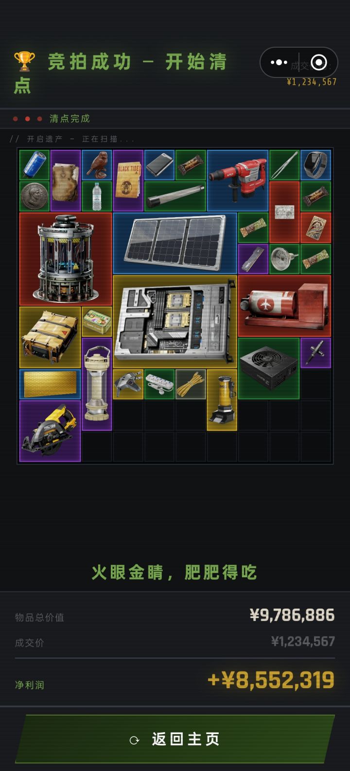 不是别人都退了,就正常拍卖我出了个小bug上面的出价条回不去了,我又在刷牙,就懒得算钱随便按的按着按着发现我用8块钱拍到了,点开一看竟然有500万,直接给我笑裂开了另外两个人互相标价,应该是都高出了自己心理价位(印象中是一百多万)好像是第三回合,俩人突然一起打了个0,我都不知道自己出没出价,仔细一看我出了个8...
