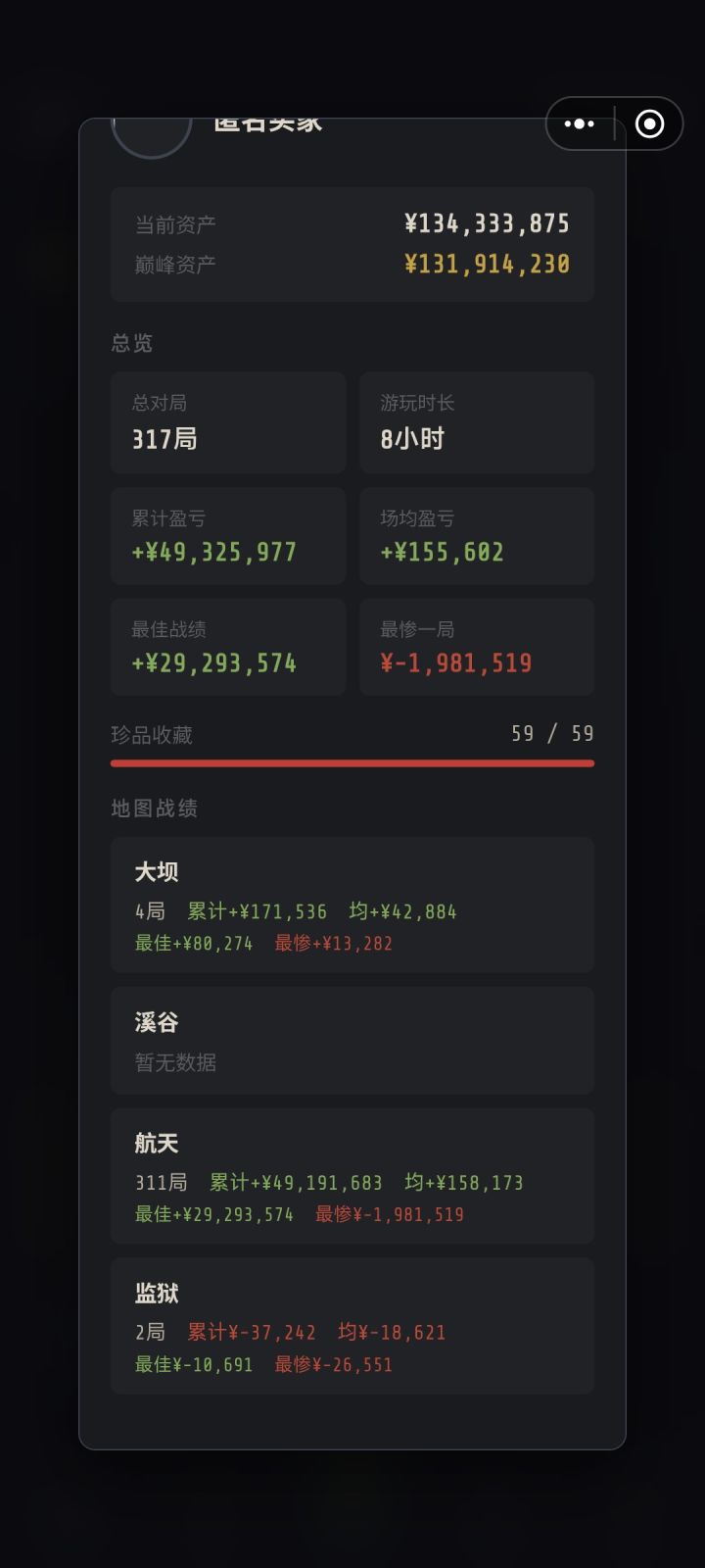 第一次发这种帖因为更新之后很挣扎 更新前后体验差别有点大一共50+h吧,从大坝到监狱 从0到收集完,感谢没更新前大坝的技播哥让我666666拿到了第一颗心给我原始积累终于靠着狗运单格80w信息 算到了最后的泪 420w血赚420+2900w 我只能说 最近一次更新之后厌倦感大幅上升 5局拍不到1局 1.自己没信息对面有了直接超几百万赚米2.别人33是300w 500w往上的