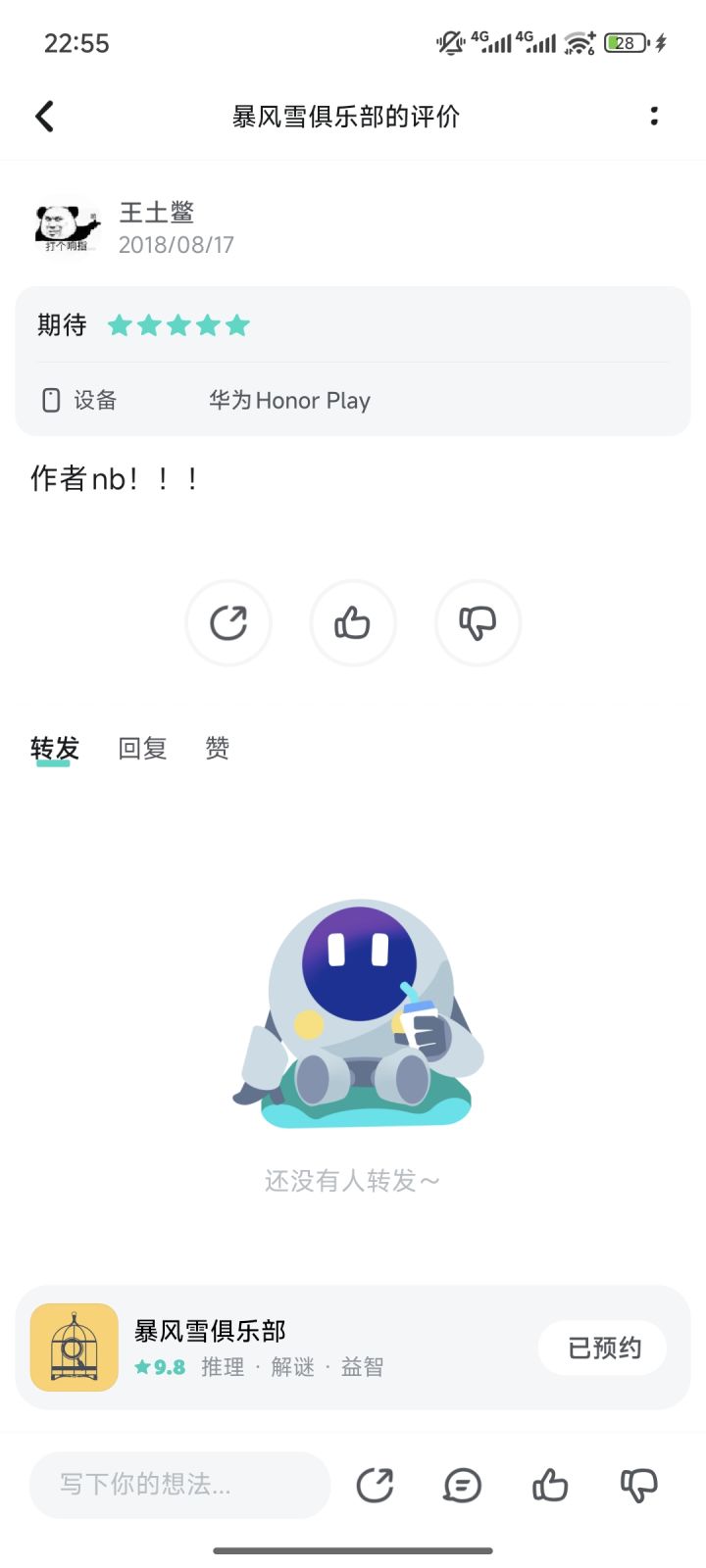 剧情:主角通过最初的测验→加入暴风雪俱乐部→和舒芙蕾妹子一起玩芯片游戏进入热身剧本→在一个小密室里发生的案件→推理得分→以后可能还会攻略角色/切换主角,大致是这样的。希望以后在现实世界和剧本世界切换的时候会有更清晰的过渡,剧本当中穿插着主角的吐槽,“不仅长得随便,说话语气更是随便”笑死我了,这就是可靠的高智商的闷骚男人内心的独白吗×还挺可爱的