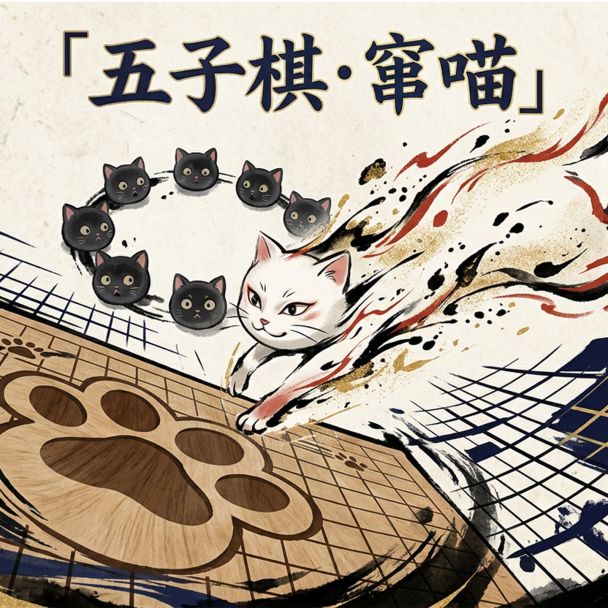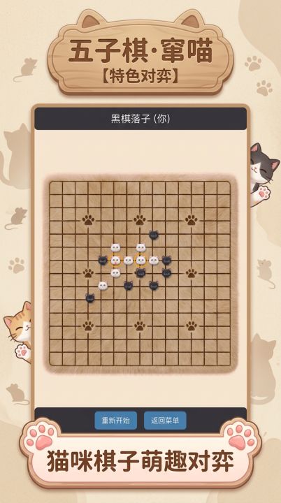 支持人机对战和匹配对战的五子棋游戏,由可爱的小猫构成棋子,含特殊棋子移动规则:被堵住三面的棋子会自动往没有棋子的方向移动一格。