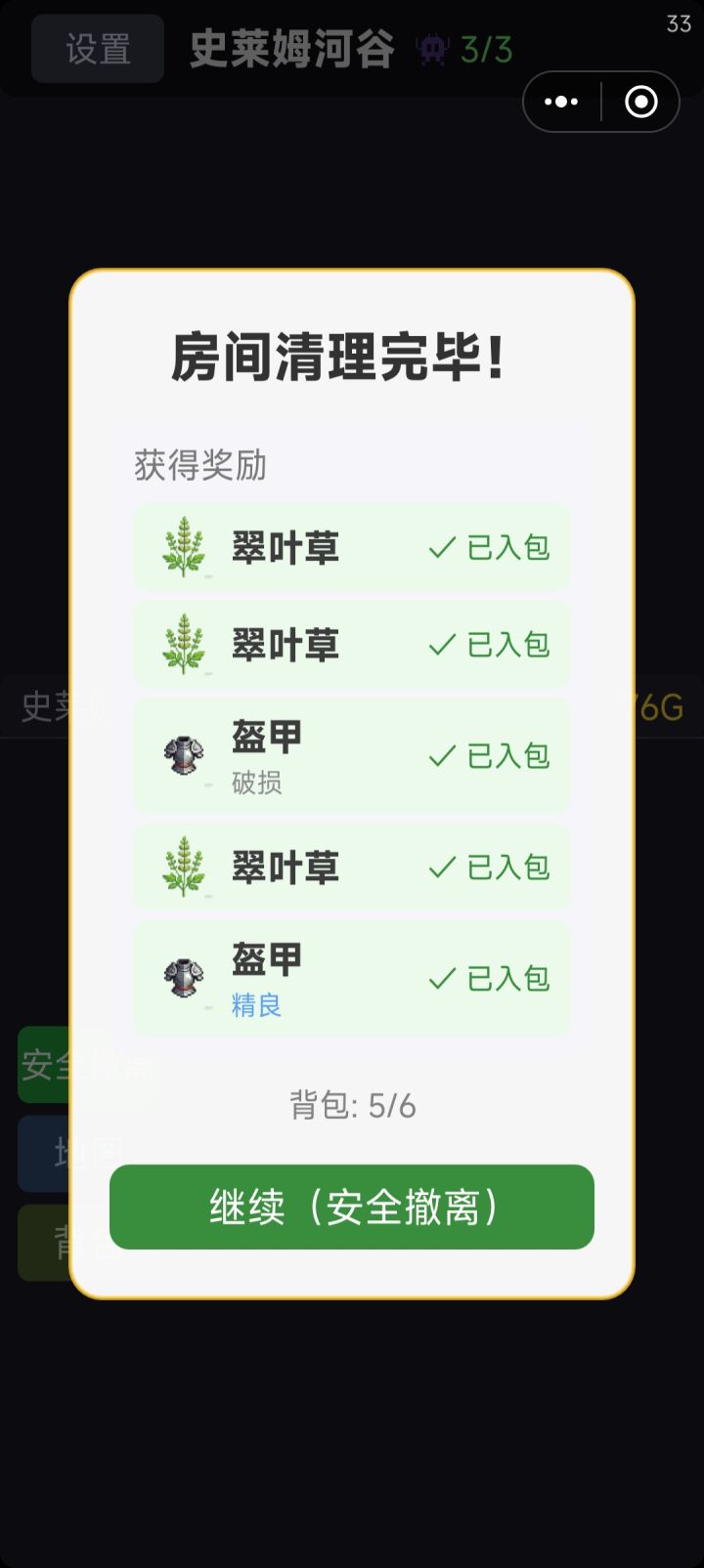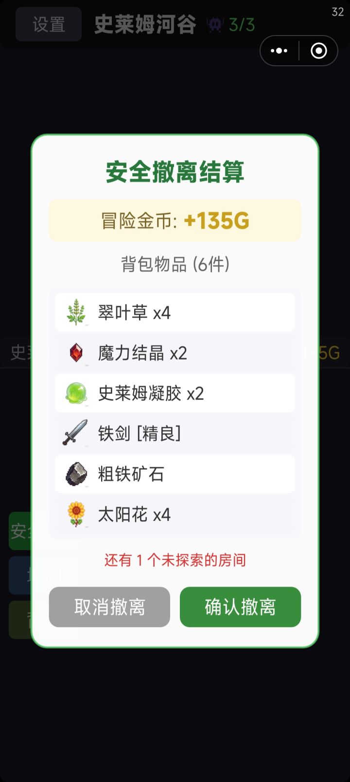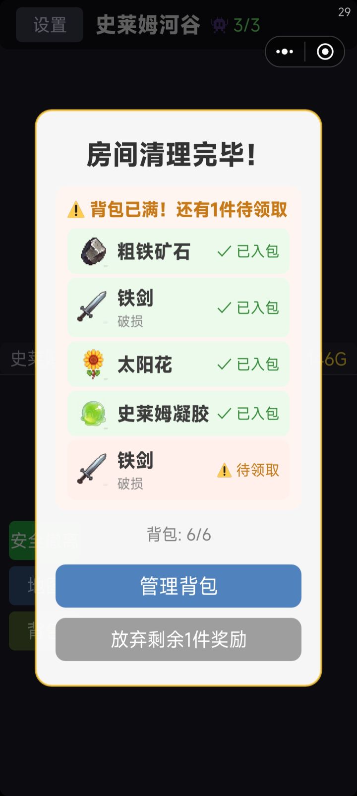 比之前冒险模式提升很大,但是相对而言难度指数系提升,boss血量掉到一定程度会跳的圈变大,这个不是问题,问题是能在本来圈大小突然变大,这有点防不胜防,不过这也还好。主要是小史莱姆刷的位置离得太近,能直接堵死一条命,现在冒险模式相对来讲是前期最好获利的,附带了5张结算图,感觉冒险模式也可以加一些采集元素?装备现在还是不能带,有群聊吗,想一起讨论讨论,还有就是看看老师准备怎么做。顺便一提