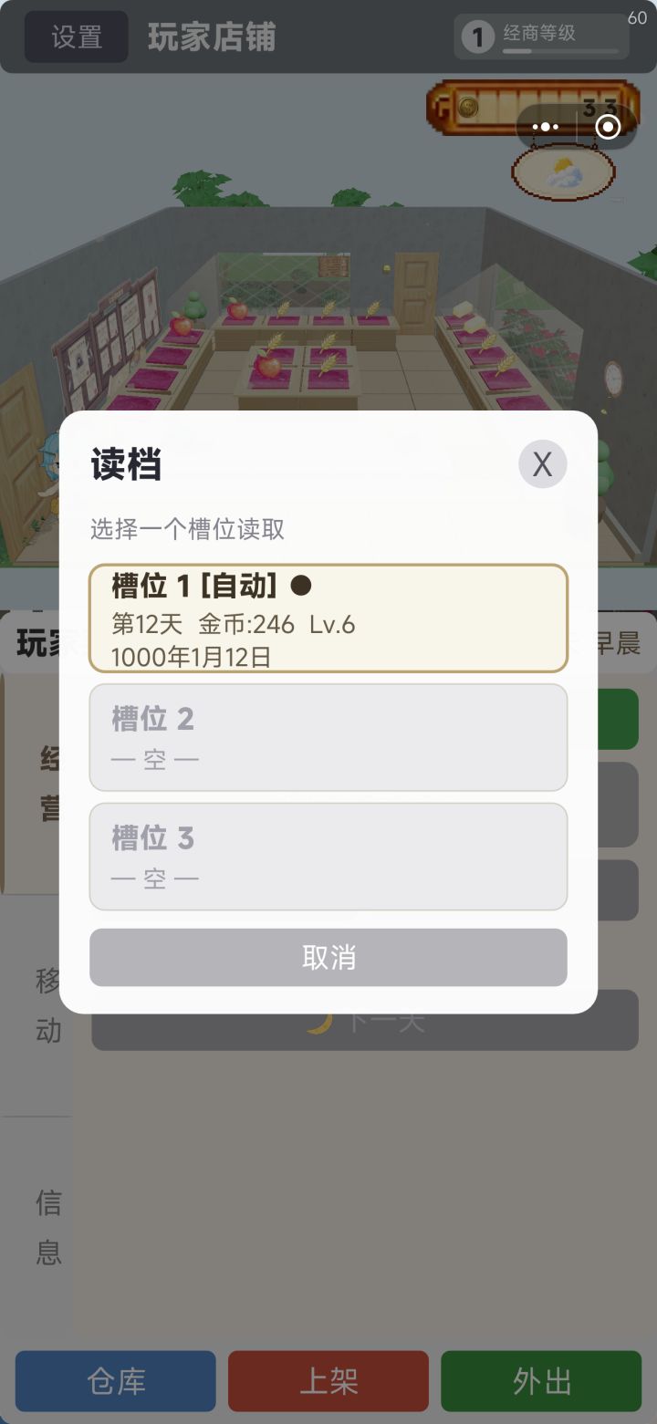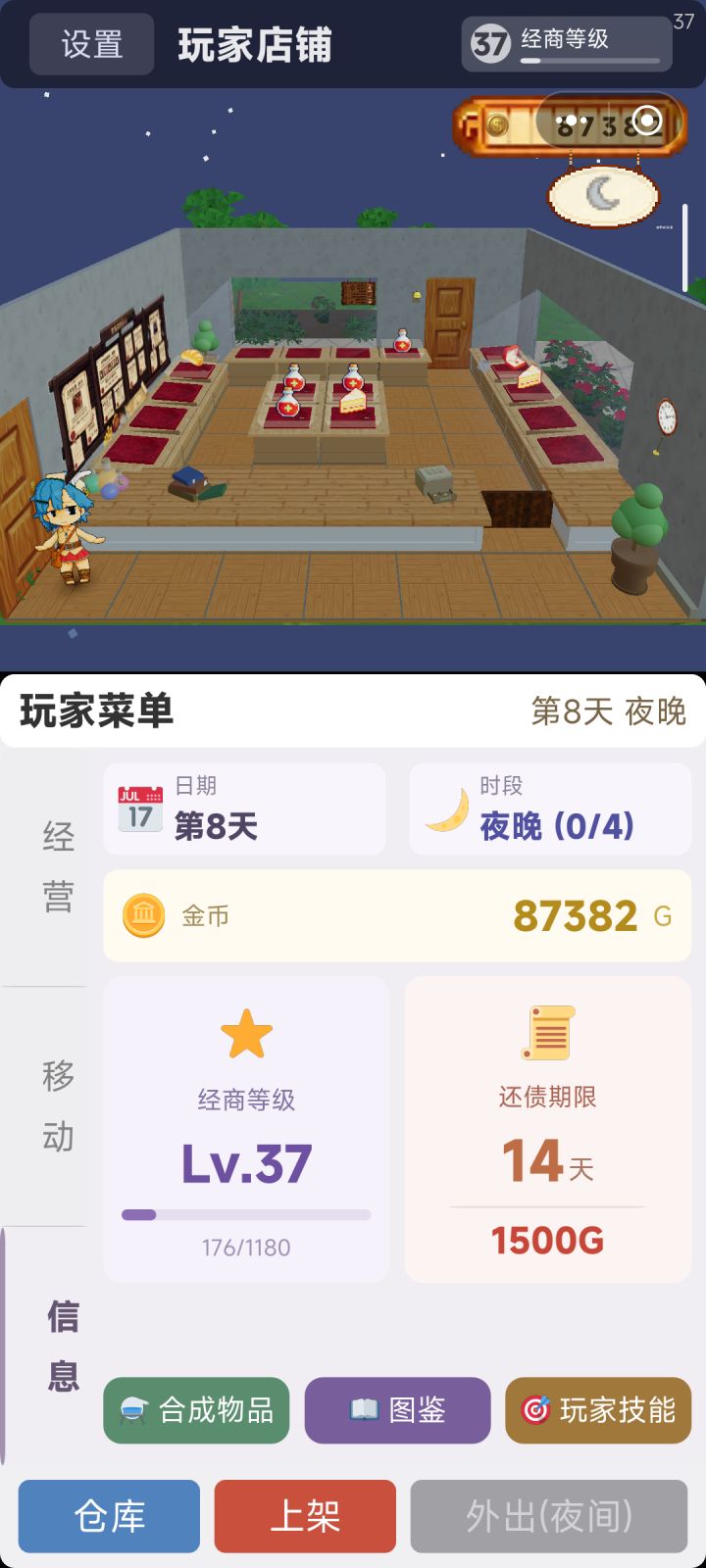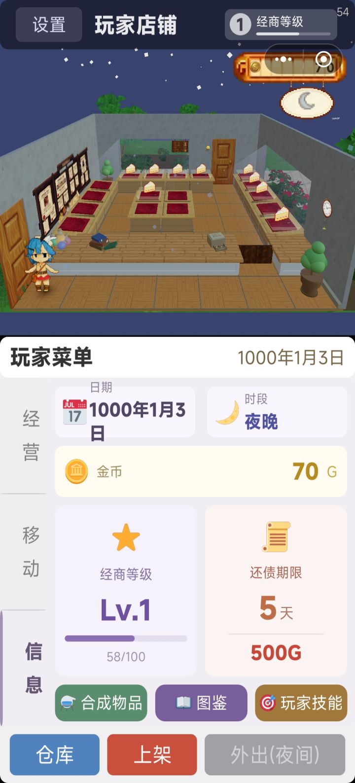 老游戏,挺怀念的提两点改进首先是时间,老游戏是一天有四个时间段分别是早中晚夜,即四个行动点;经营一次需要一个行动点,下迷宫打素材需要俩,部分村镇剧情事件需要一个(当然这游戏应该还没有剧情)其次,ui设计细节的打磨,商店界面购买操作会回弹;商品上架离开店铺后会自动下架希望继续改进,改天再来看看