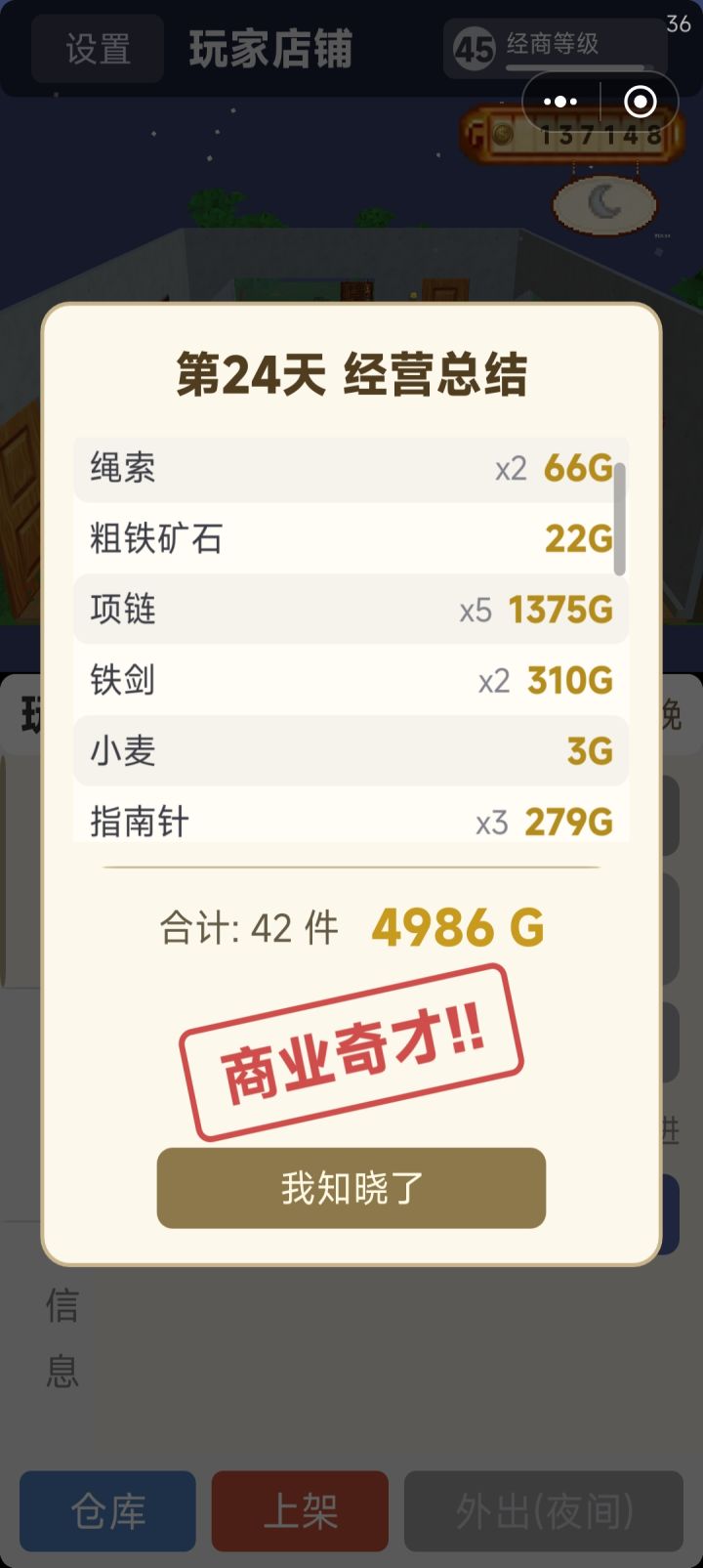 喜欢这种中间商赚差价的游戏(奸商我来啦)!很喜欢游说和讨价还价的设定,很有意思,希望游戏更加丰富,有趣摩多摩多,加油加油bug:1.一键上架选商品的时候,底下的商品每次勾选后总是会自动回到最顶上,上架时就要反复拖动列表,比较麻烦。全选只能选中界面里面的几个,意义不大。2.被怪物打死后读自动存档回到当天早晨,但是商店买过的物品会显示已经被买过了。建议:1.一键上架:加价比例建议增加一个75