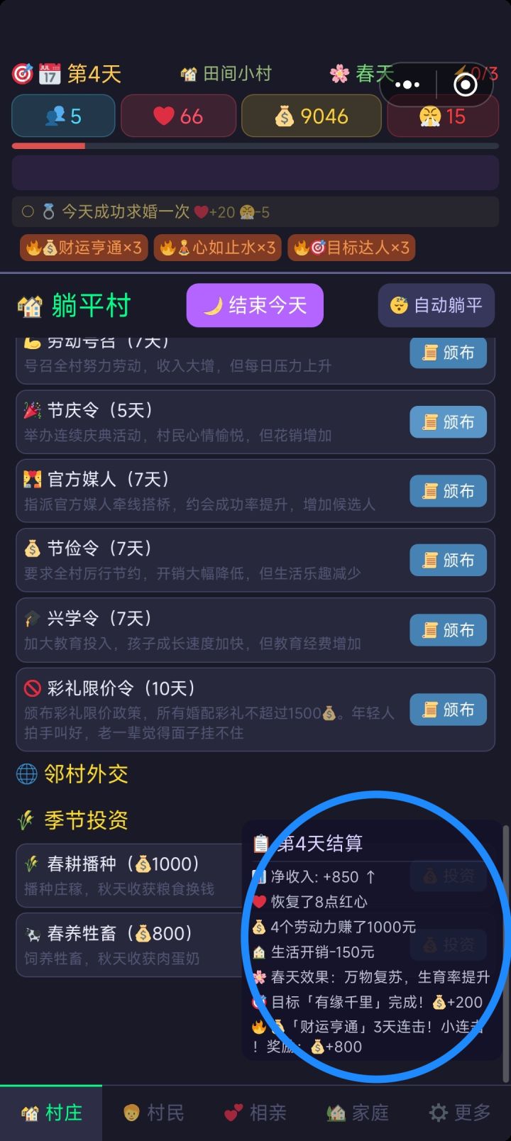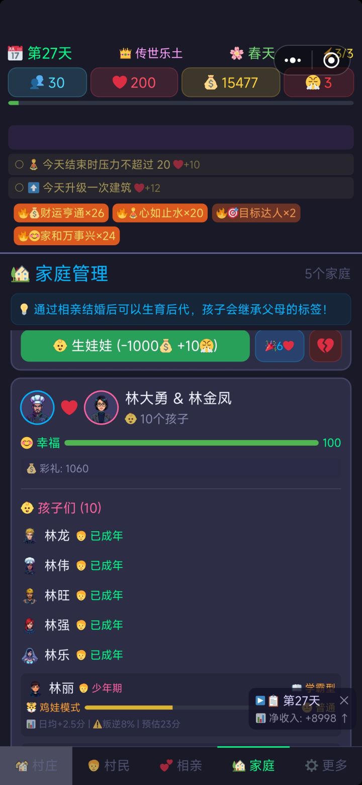一开始疑惑不能自己兼职赚钱养村吗,而且竟然不能干涉村民的矛盾,我就像无能的丈夫看着他们一直吵吵吵。生了两个孩子才发现好像我们不是一个具体的人,而是随机控制村民相亲,我说咋结了婚还能相亲呢()
