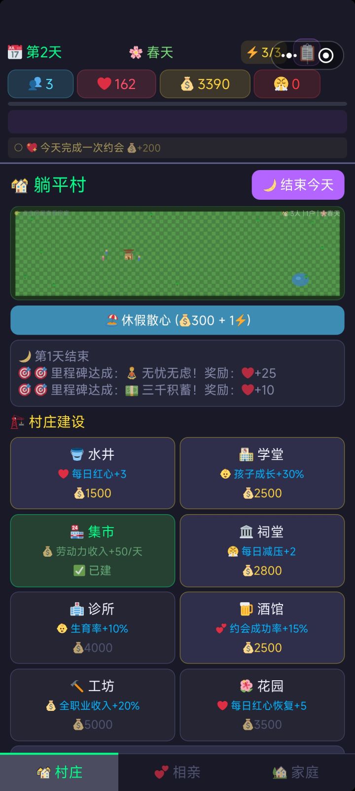 整体其实想法挺好的,但是暂时内容有点点单调,在建完建筑之后就没什么有趣的内容了,重复约会结婚生孩子就行,希望可以继续优化,拓展更多的玩法