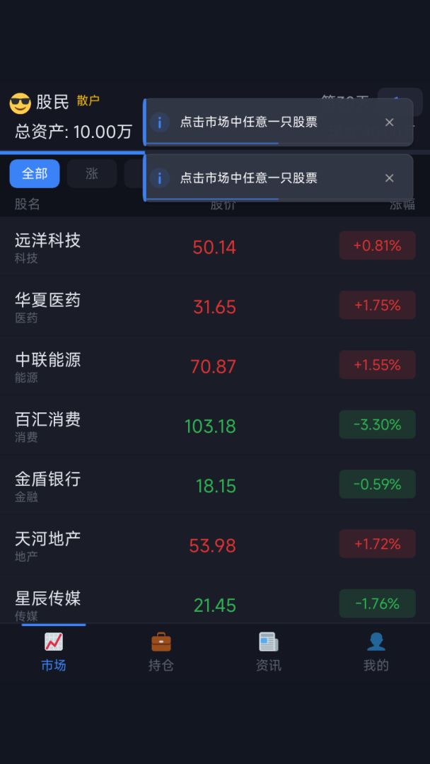 股票模拟经营游戏,竖屏操作。在市场页面选股买入,赚取利润晋升段位。