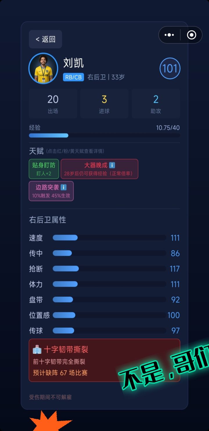更新内容:1.调整赞助签约成功概率(大幅上调)2.专属天赋可以和粉色天赋产生羁绊效果,同时首发时可以都增加5%触发率(效果不可叠加,最高增加5%)3.新增红色天赋,不死老兵,退役年龄延后6年(41岁不会自动退役),新增红色天赋队魂核心,每个赛季队魂经验获得增加30%(不可叠加)4.增加国家杯60层可以领取荷兰名将范戴克,国家杯可以广告增加挑战次数5.调整继续游戏和新建间距,增加球员年龄显