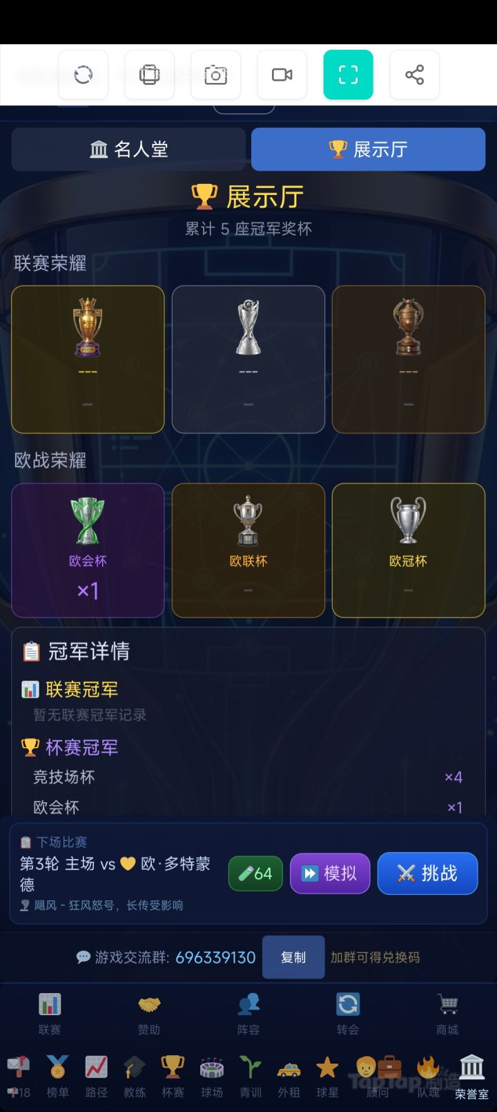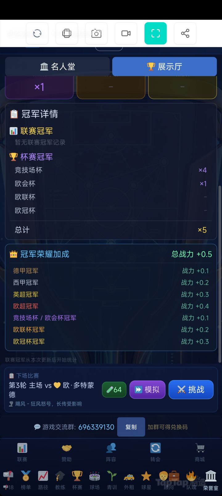 更新内容 1.开放欧超联赛,冲击更高荣耀 2.名人堂改名为荣誉室,增加展示厅,可以展示冠军数量,冠军增加能力(每种上限100)3.球员上限提升为600,550-600提升经验提高,教练特训对于550-600球员效果减弱4.修复若干bug 欧超已开启,准备冲击最高荣耀了吗??