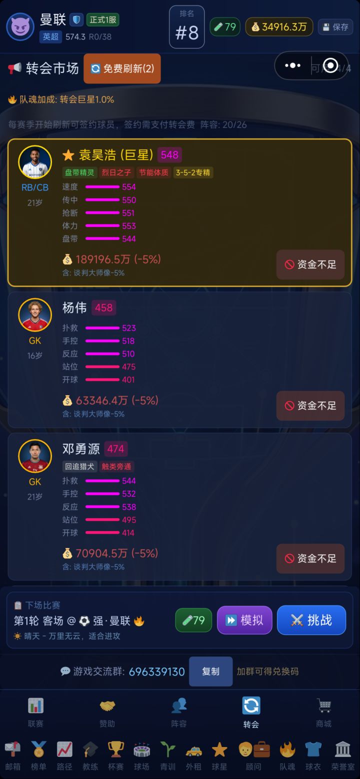 第一是穷,越往上越是穷,到法甲意甲已经全是几千万的球员,一年赛程下来入账都还没千万,青训开销不大就不说了,还不算顾问、王牌教练这种动辄千万的开销,我玩到这个阶段刷出再极品的低龄球员也已经买不起了,哪怕这个阶段多玩几个赛季,钱也基本上是花在买教练开青训身上,这方面设置的梯度多少有问题。然后是球员问题,一方面是成长太慢,因为每往上打一个阶段不换几个人的话有降级风险,越往上跨度越大导致保级困难,另一方