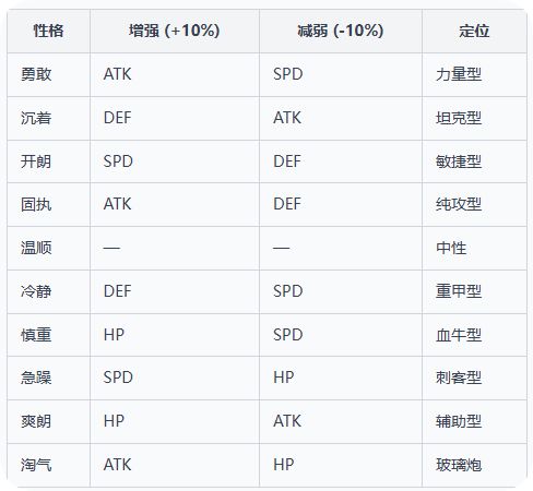 10 种性格各自 +10% 一项、-10% 一项(温顺中性),仅在战斗期间生效,不改变存档永久属性:性格增强 (+10%)减弱 (-10%)