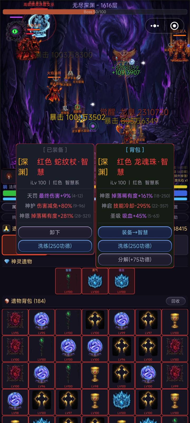 伤害完全溢出,能不能出个二倍速三倍速,或者弄一个跳关,多少时间之内通过可以跳个十层八层的还有一些小问题,比如闪退啊,神灵遗物属性不显示啊,还有一个不确定的(伤害一超千万亿级人物就直接死了,就是打不出来千万亿的伤害)导致我装备都不敢更新了,一换就死了