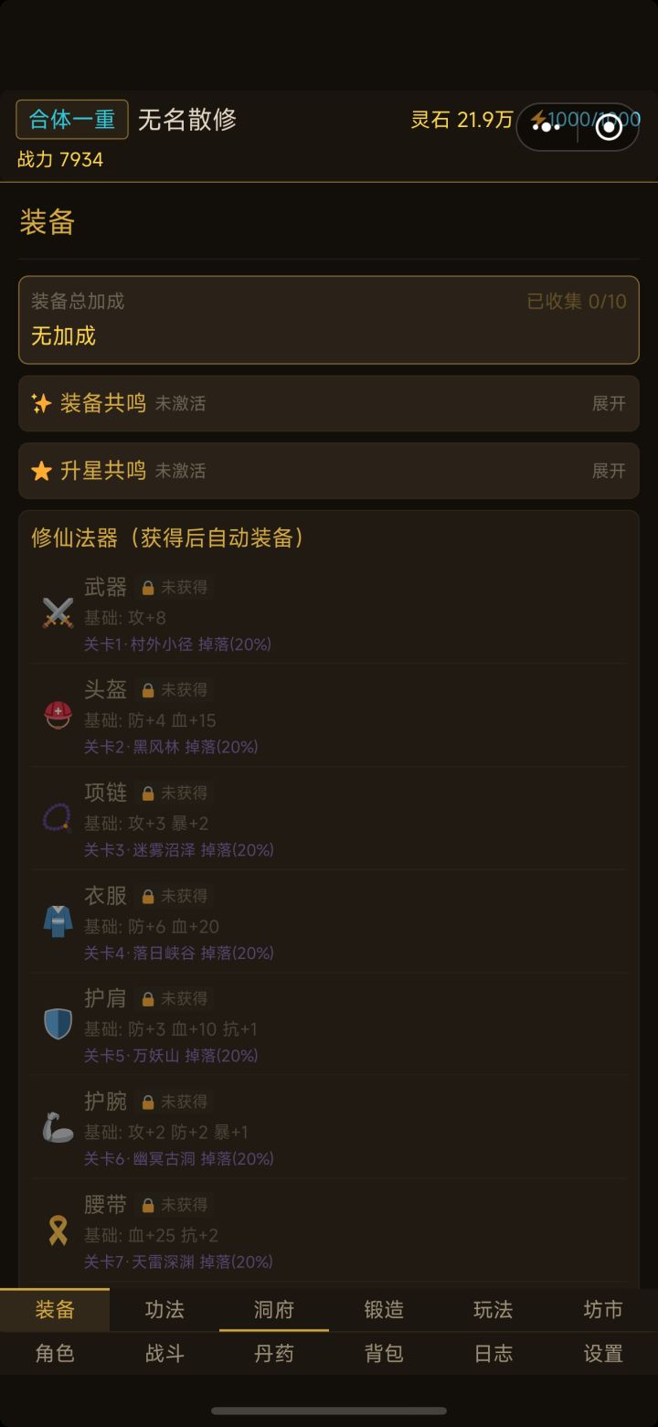 v1.0.6更新公告(大退tap重启更新)1.修复功法修炼倒计时不刷新的问题2.修炼界面优化3.修复概率回档的BUG4.增加升星共鸣5.坊市补齐功法6.增加boss扫荡(还需要优化)7.装备界面优化8.新增宗门系统(元婴一重开放)首次选择有属性侧重,目前不能更改9.改名系统可用了10.后台目前还是有问题,退出游戏清掉后台