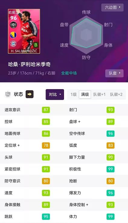 萨利哈米季奇为什么叫天使之翼? 萨利哈米季奇无论场上还是场下,你都能感受到他身上爆发出的热量和激情。有着极佳的爆发力和速度,在他全盛时期,他是任何对手左后卫的噩梦,而拜仁的球迷也亲切的送给他一个绰号“天使之翼”。 评级:96 位置:右前卫 风格- 全能中场:整场比赛不懈奔跑、覆盖整个球场的球员。 身体:8.5分 176的身高 他的对抗能力还是不错的,边前卫里也算强者了! 速度:9.0分 93的速度