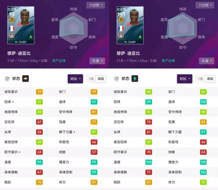 风格:高产边锋-站在侧翼位置接收传球的球员,当机会出现时,偶尔也会切入中心。 迪亚比-状态也是近期一直火热!真是潜力股啊! 他的满99的双速惊人,99的身体控制,总能出奇不意地以他的技术发动突袭,凭借顶级的爆发力 超强的身体控制能力,手感好过人还是不错的。盘带极强,就是体能差点。 最佳状态的他 超强的双速加上完美的盘带和身体控制能力,过人手感是真爽,只要他有足够空间,后卫能让他过个遍。而且禁区内射