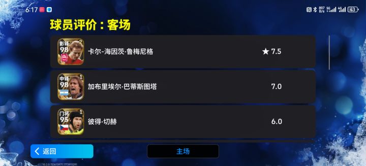 因为抽不明白国服花里胡哨乱七八糟的池子,我玩的国际服(以前微微微氪进去攒点币不容易结果每次有想要的球员都抽不到)之前一直坚持4213的阵型,结果打efootball AI联赛,打到组1太太太折磨,这赛季换了个523神阵,上分轻松了很多。直接一路平推到1700分,后面73胜率渡劫成功升上组1。(连我这个糙哥都能上)下面说说我从珠海学来的阵型(好像是根据职业赛冠军选手的阵型出的):这