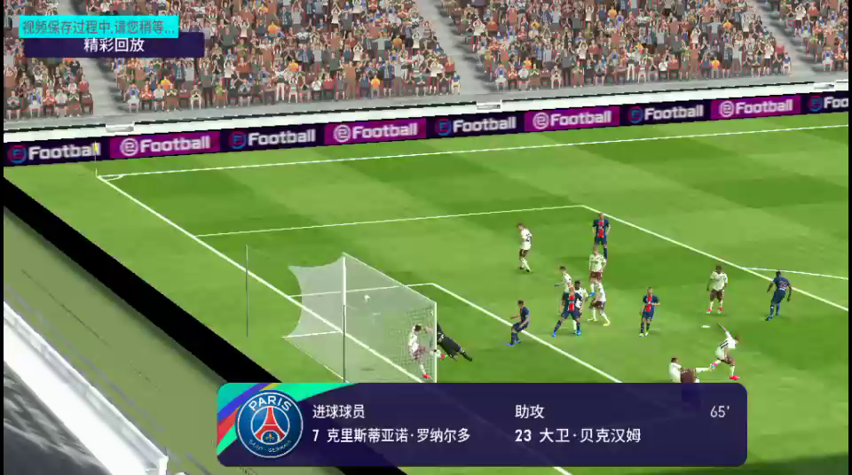 小贝开左侧角球,C罗前点倒勾破门