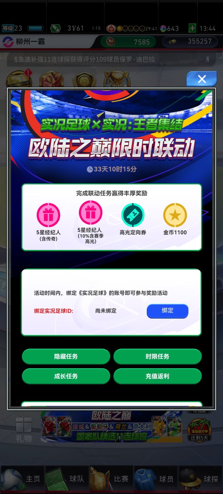 实况足球玩家找 集结玩家联动,任务25号六周年活动开始,充值1000反400,互惠互利,互相做任务,有需要的联系,充值多少就按比例反现!!