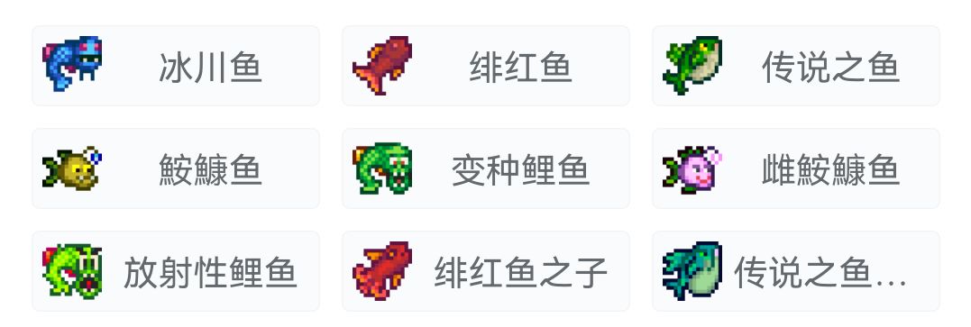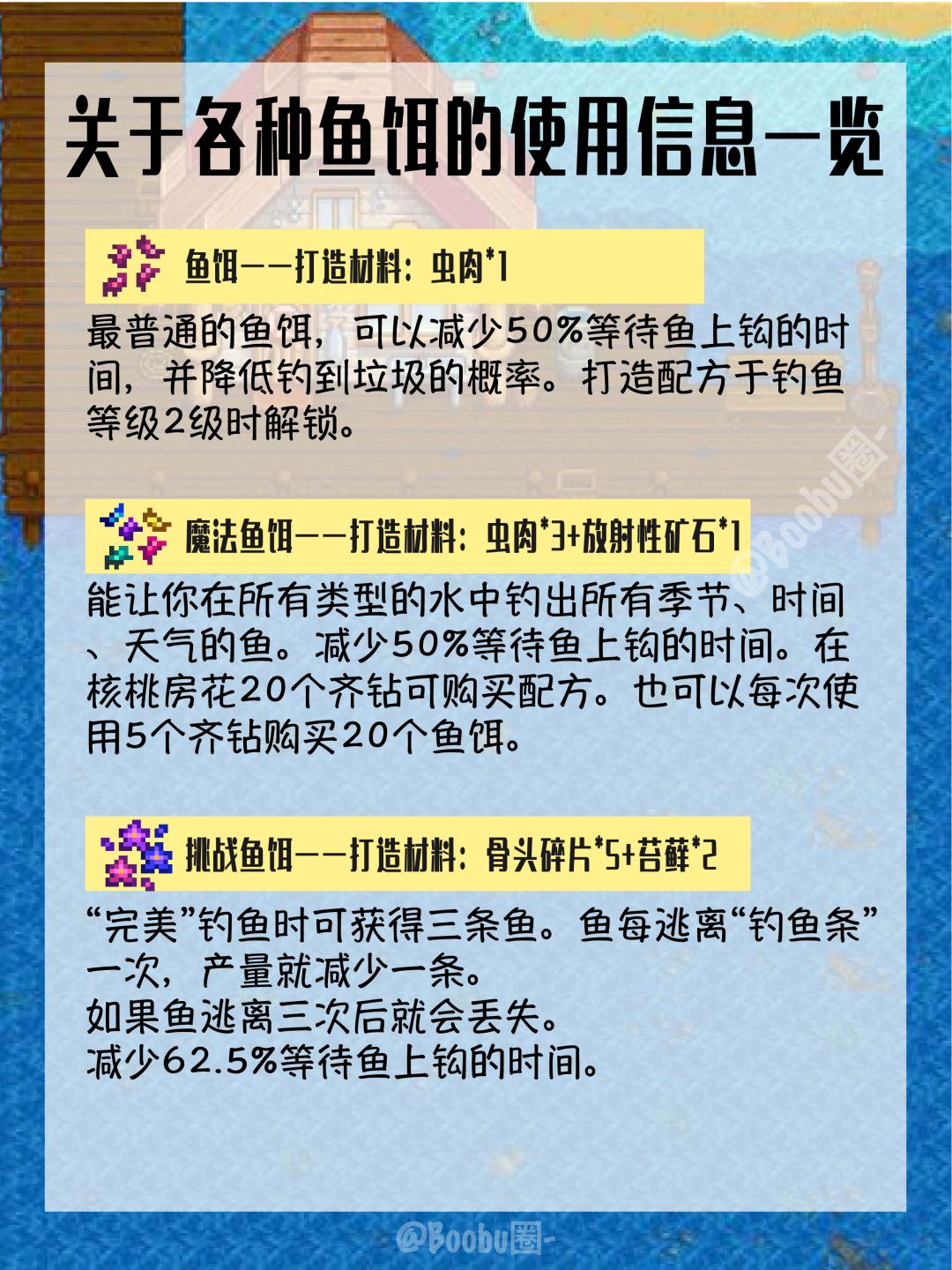 春季的Legend(传说之鱼)、夏季的Crimsonfish(赤红鱼)、秋季的Angler(安康鱼)、冬季的Glacierfish(冰河鱼)以及在下水道中的Mutant Carp(变种鲤鱼)。 🐟🌸春季鱼王(Legend): - 出现条件:春季下雨天,6:00-22:00期间。 - 钓鱼等级要求:10级。 - 地点:矿井前的湖泊。罗宾家东侧 🐟🌳夏季鱼王(Crimsonfish): - 出现条件: