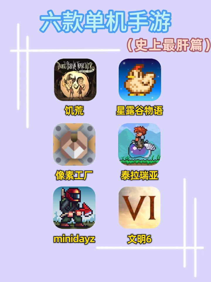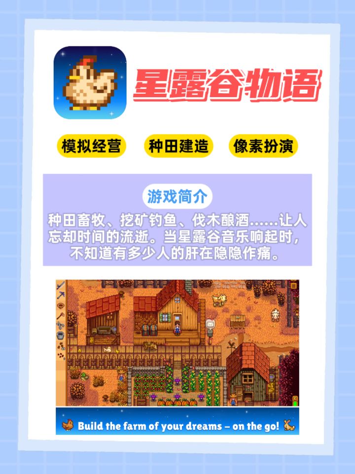 📚《饥荒》📚无数人内心满分的单机🌟佳作,在这里扮演一名被传送至荒无人烟异世界的科学家👨🔬,依靠自身收集资源,制造物品抵御各种威胁存活下去。💪🌱《星露谷物语》🌱种田畜牧、挖矿钓鱼🎣、伐木酿酒🍷……让人忘却时间的流逝⏳。当星露谷音乐响起时,不知道有多少人的肝在隐隐作痛。😣😣🏭《像素工厂》🏭开炮!💥一款以资源管理为核心的无尽塔防🛡️游戏,通过建造精密的传送供应系统,🔄确保你的炮塔能够火力全开