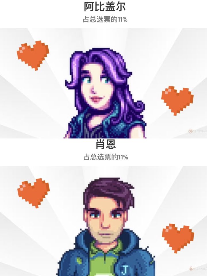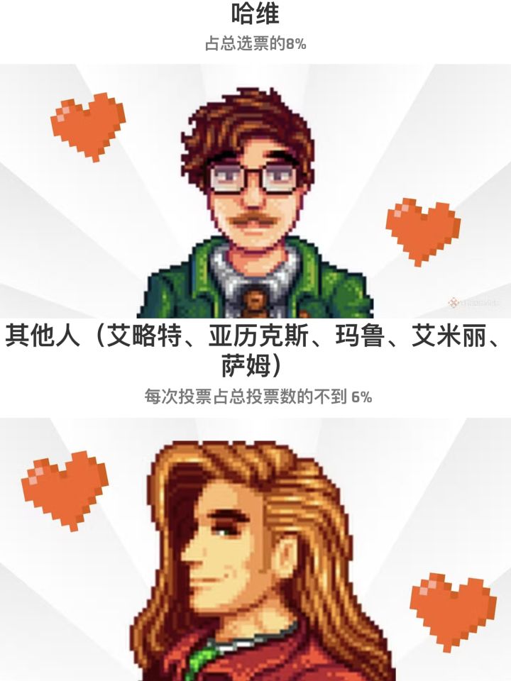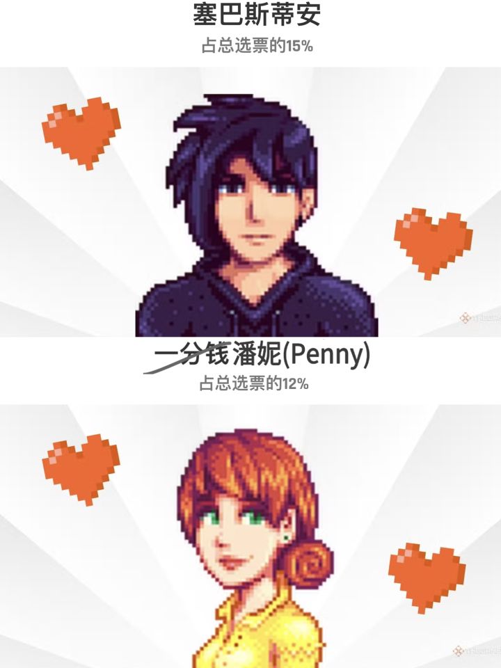 【不出所料那个男人就是第一名嘛】外媒Thegamer统计《星露谷物语》玩家最想结婚的几位NPC,数据来源于Reddit的帖子和星露谷官方论坛的763张非官方人气选票:1.塞巴斯蒂安 15%2.潘妮 12% 3.阿比盖尔 11% 4.谢恩 11% 5.海莉 10% 6.莉亚 10% 7.哈维 8% 8.艾利欧特、亚历克斯、玛鲁、艾米丽、山姆 每人占比不到6% 而且原文给他们评价非常
