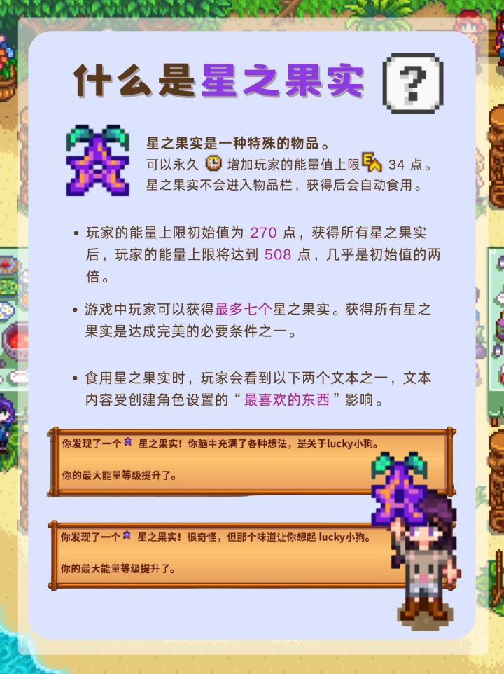 老乡们这期是新手一定不能错过的星之果实全收集攻略!你的星之果实全都集齐了吗?前期干活总是感觉体力不够?那你一定需要这份星之果实攻略!星之果实可以永久增加能量上限,一颗下肚干活都有劲了💪🏻每个人最多获得7个星之果实,全部获得可以解锁“星之果实的神秘”成就⭐ 以上内容整理自星露谷wiki#星露谷 #发现好游戏 #星露谷物语 #星露谷物语攻略 #游戏日常