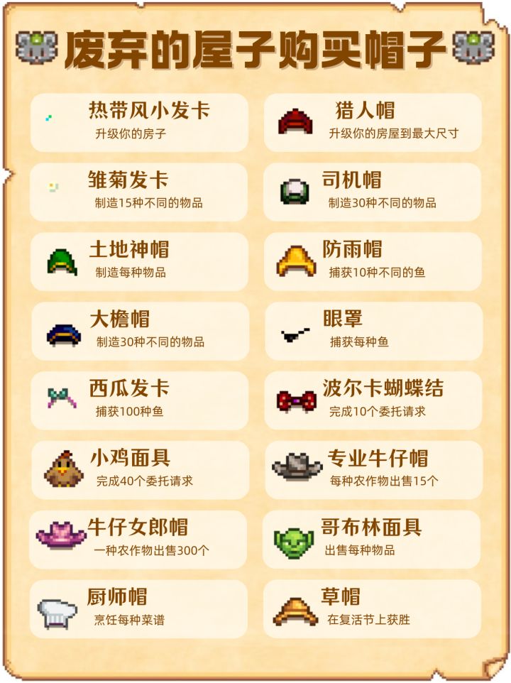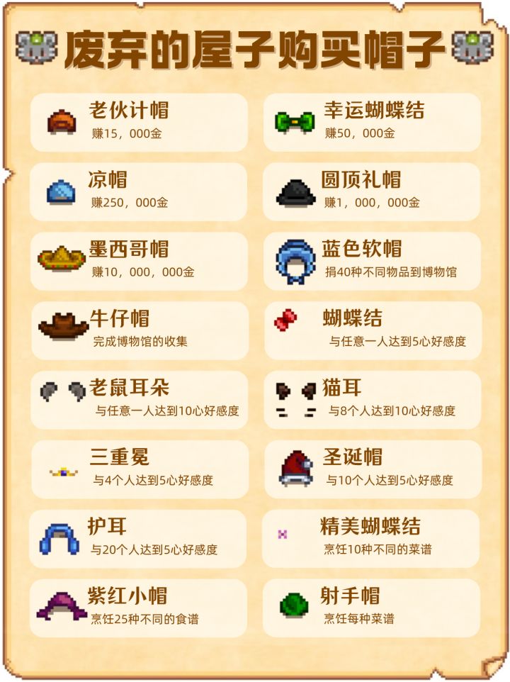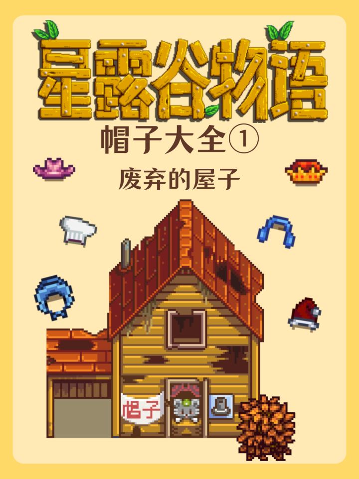 星露谷帽子获取的方式非常多,大多数成就都可以解锁一个新的帽子,并可以在废旧的屋子的老鼠那里购买。一些帽子只能通过特定的节日、赌场、探险家公会、骷髅洞穴的宝箱层获得。帽子也可以使用缝纫机制作。本篇主要介绍 可以在废旧的屋子购买的帽子,一共有43种。帽子不仅可以玩家自己戴,还可以给孩子带,给马和宠物戴,给鱼缸里的海胆带,还有外星人稻草人也可以戴。以上内容整理自星露谷wiki#星露谷 #星