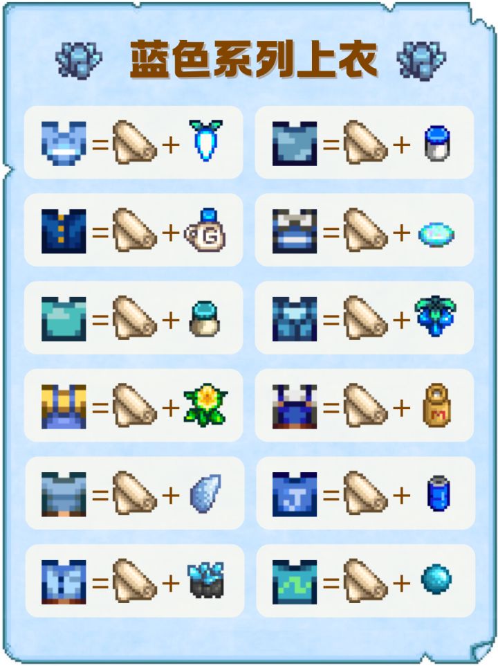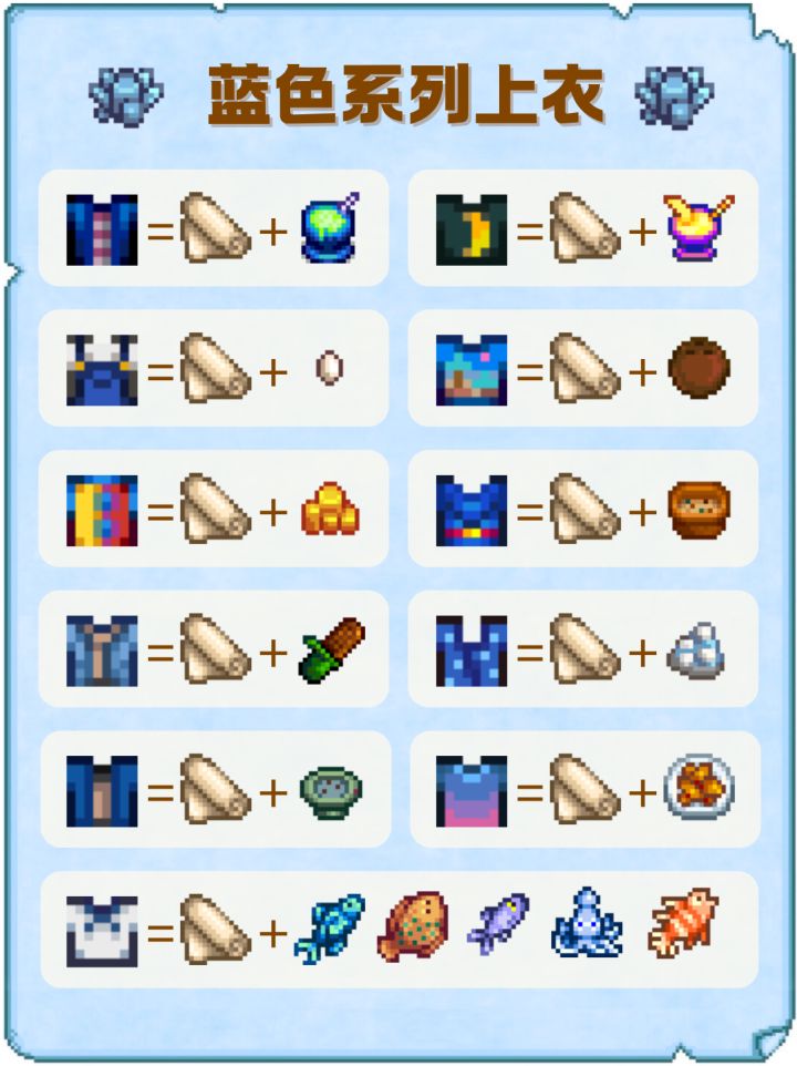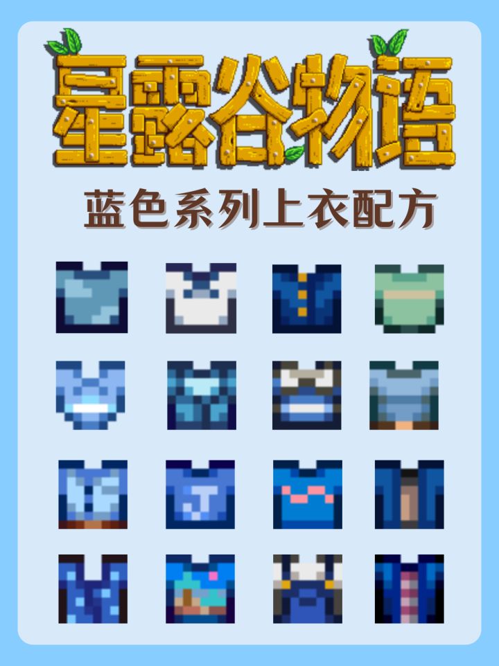 本篇整理了许多蓝色系的上衣配方都是无mod版。用joja可乐居然可以制作joja工作服!!我很喜欢第四件那个白色娃娃领的上衣,特别美萌百搭的一件🧁老乡们都喜欢哪件上衣呢?以上内容整理自星露谷wiki#发现好游戏 #星露谷 #星露谷物语 #星露谷物语攻略
