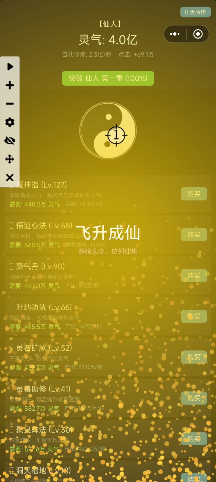 很不错的小游戏,就是有点短,大概十三分钟就飞升成仙了,飞升成仙后又回到练气期了,直接重走来时路这是我没想到的,我还以为成仙人后还能升级呢,想着能升到大罗金仙或者道祖呢,总之强烈推荐的一个升级类数值小游戏,期待作者好好更新,把游戏做长一点,可以改一下成仙后重修的设定,来个本地存档,能一直刷数值,最好能刷装备能打怪,搞搞宗门功法灵根什么的