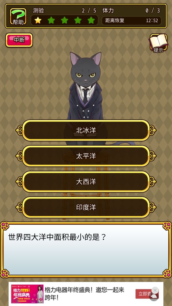 我点了北冰洋是错的,我想说不可能,点了3次,然后没办法所有答案都点了一遍,最后点的是绝对不可能的最大洋太平洋,结果对了,优秀啊,我有多崩溃看了多少次广告视频你知道吗<(`^´)>