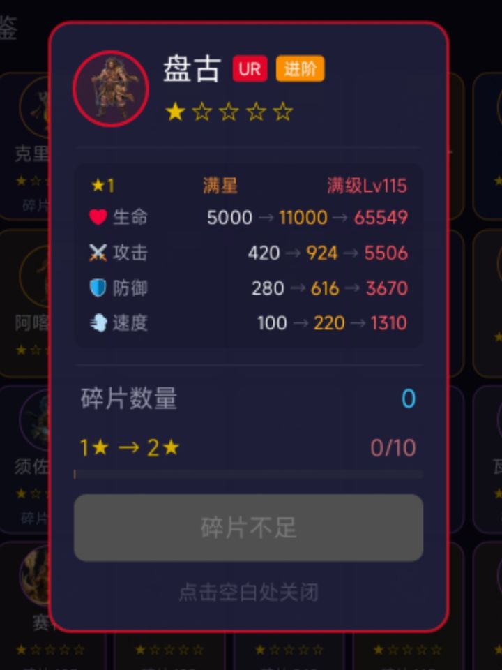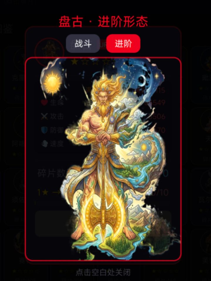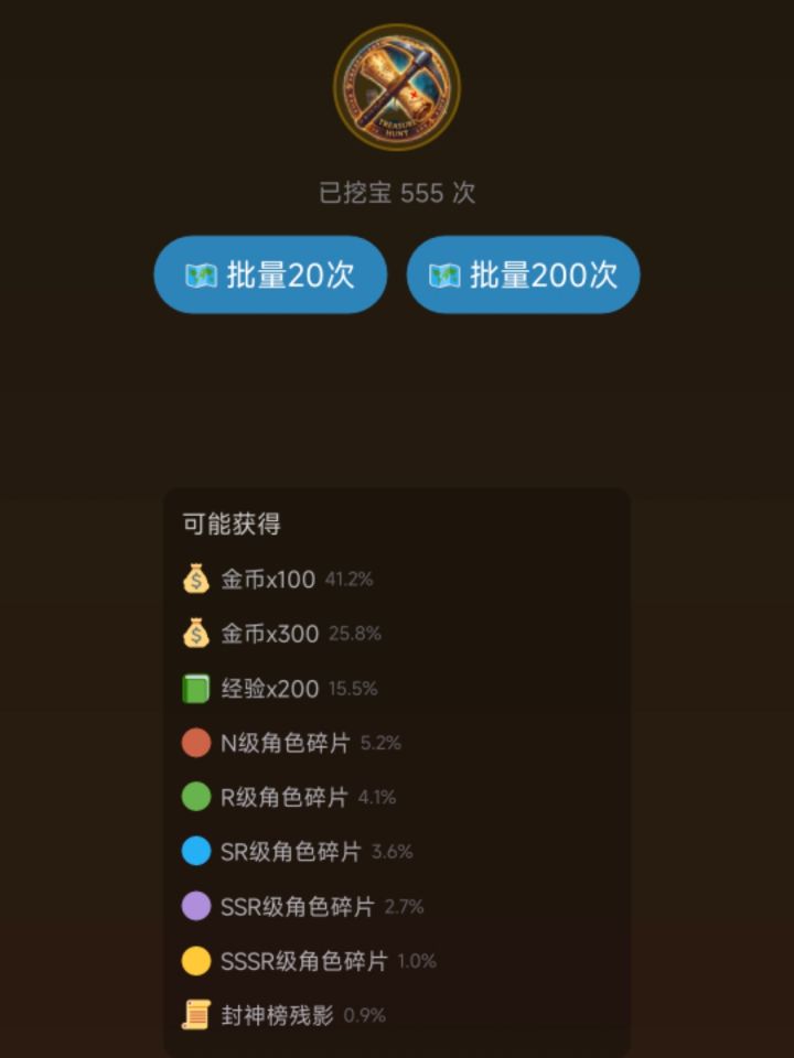 2026.04.03更新1.调整排行榜显示内容为星数、器灵、试炼(其他的等级、剧情、已达上限,通天塔主要围绕职业。显示差异化排行)2.调整封神台标签页高度3.新增神话英雄UR盘古,拥有超标的8技能数量,和神器盘古斧专属翻倍4.更新挖宝按钮添加批量200次,移除单次按钮,美化挖宝背景