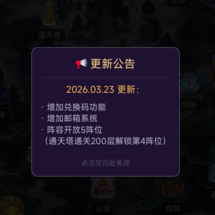 2026.03.23更新:新增兑换码,阵位开放5位(需通关通天塔)。兑换码需审核通过并游戏重进后可用(预计11点20通过)(游戏清理缓存需要进入游戏后点击右上角三个点,然后点击重新启动)兑换码 奖励vip666 封神榜残影x10vip888 封神榜残影x10vip777 藏宝图x50fssxl 封神榜残影x100 + 封神诏令x15 + 龙灵x1sxl1 封神诏令x5gmkl