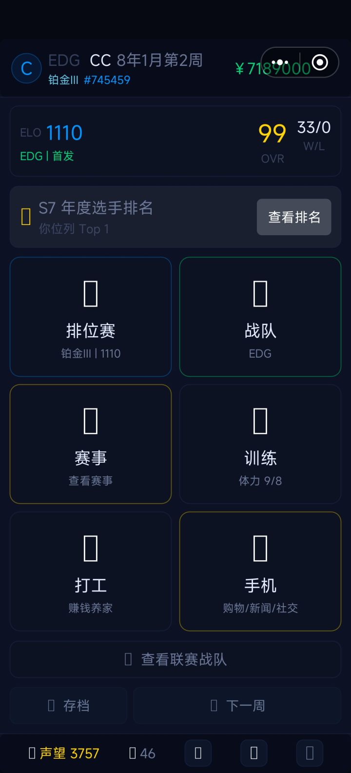 ui改一下 有点遮住了 页面图标文字再大一点所以按钮加大加粗 底部的 金币奖杯全部合并在顶部顶部加日期时间 时间自动走 可以跳过到下一周图1 底部的宣布退役可以其他位置 放这里会时不时点到图2 ui可以改一下 每个战队的后面加上简称 每个赛段4强到冠军放在赛段中间 阶梯式 底部的战队积分和历年冠军可以单拎出来做一个放在主页面图骗3 战队信息可以改版一下 例如顶部一排标签栏 战队信息(