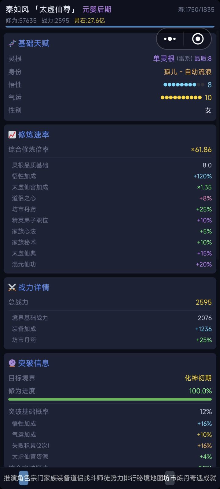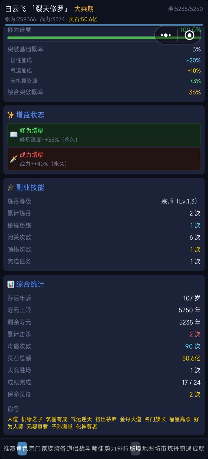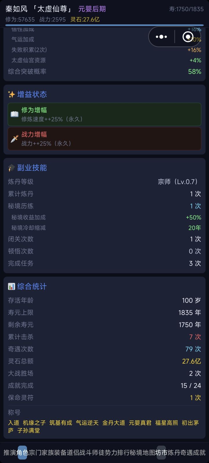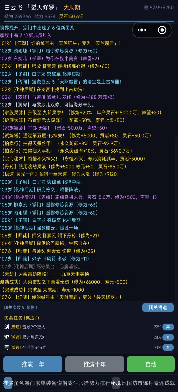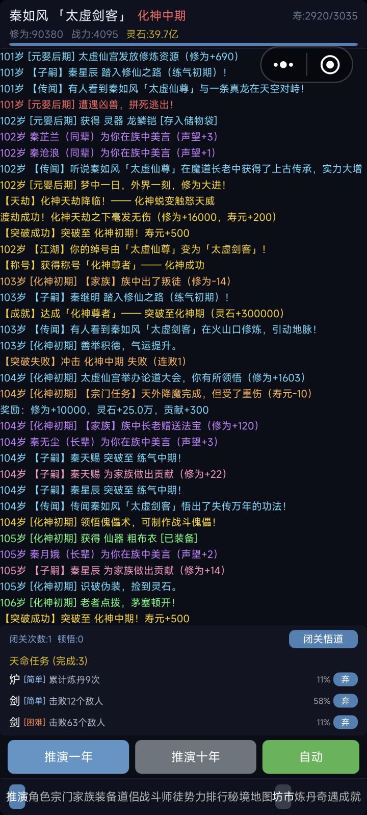 刚开始没看到下面小字,一直推演到元婴,别人打上门,说切换到战斗界面,才发现地下按钮可以点,只不过每次点过又回到最顶部,怕麻烦不点了