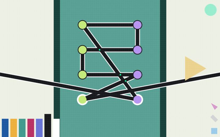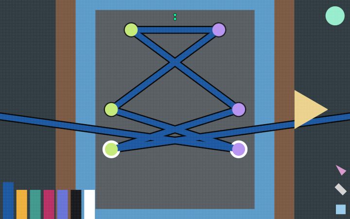 游戏的画风很简洁,简单的方块和圆圈就勾勒出各种鞋子一样的质感。游戏里基本上没有语言,都是通过图形来表示的,游戏中的关卡也由不同的图形来表示,无论使用什么样语言的玩家都能无障碍游玩这款游戏。游戏中图形和颜色的配合能够让人直观地把握游戏里各种按键的功能。比如起点圆圈和终点圆圈有高亮提醒,鞋带划过圆点的话圆点也会亮一下。失败之后屏幕会闪烁红光,右上角的圈会来回闪烁,很直观就能看出来这个圆点是复原的意思。不过光有这样的图形还是有一些缺乏引导的,比如开始界面要摁enter而不是点击鼠标,标题上有三角形的箭头,非常像开始按钮,但它其实不是开始按钮,只是一个装饰。而进入游戏之后,进入关卡又是通过鼠标点击,这样的切换一时半会很难反应过来。屏幕右下角有三个图形,这三个图形一开始也很难被注意到,第一个点击后可以隐藏鞋带,第二个和第三个图形我没有探索出功能,不知道后面的关卡有没有作用。