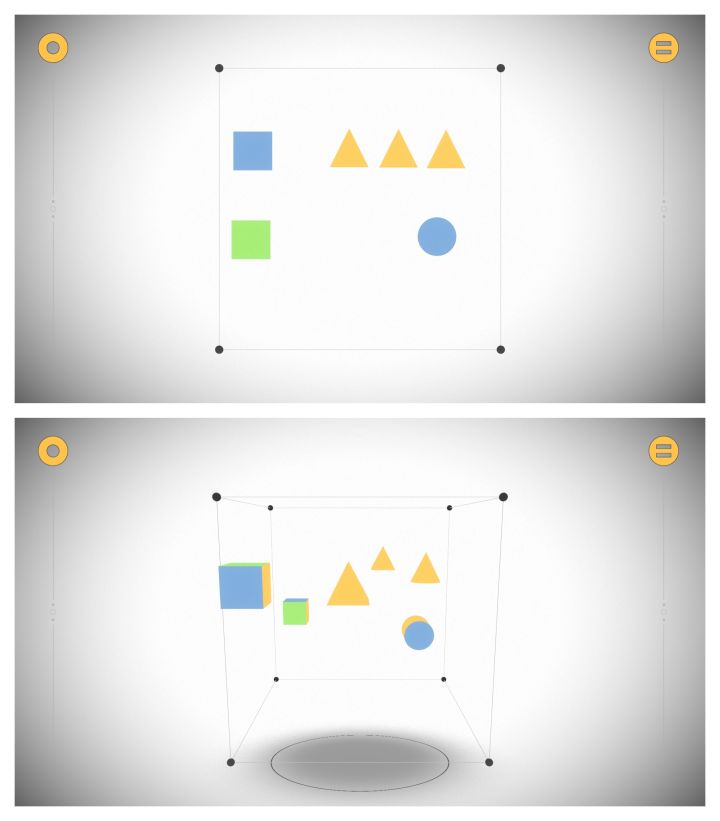 转换视角、操纵不同几何体转出相同的图形交叠重合即可过关,随着难度递增会增加数量、颜色要素,关键在于找到不同几何体在特定角度的相同面,并按合适的顺序交汇到只剩一个图形。