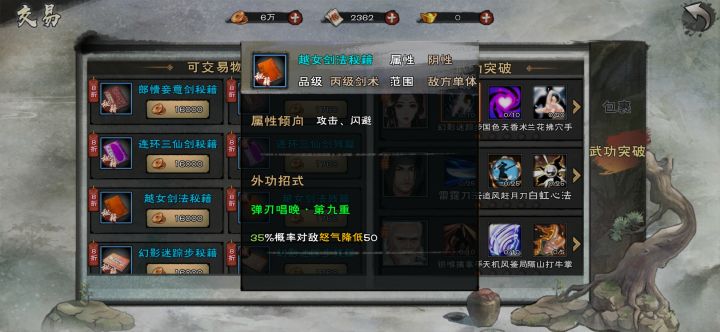 关于武当攻略推荐剑法反击推荐原因剑系武器增加反击前期普攻推荐越女剑法(嘉兴武馆)绝招门派一内至于原因越女剑法反击减怒大招是因为绝招设置成中性属性剑法伤害加成85°伤害内功推荐落魄刀客的虎啸金钟罩 原因自己对比武当一内和刀客内功星宿派玩法建议刀法拳法推荐刀法是因为后期大家血量充足基本都是属于持久战所以刀法在后期起到续航作用但是建议符文血量防御暴击攻击但是并不是主流毕竟很