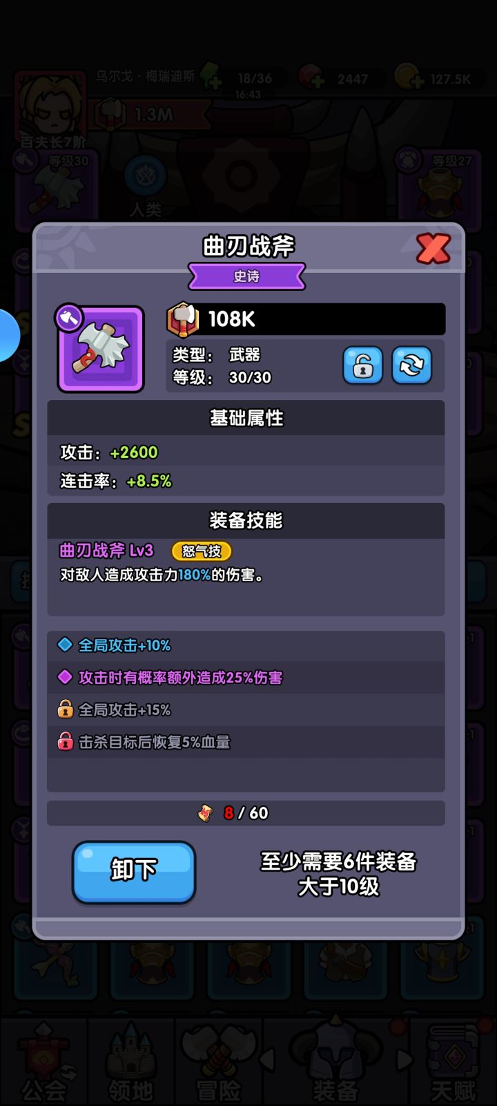 游戏不错,只是我的运气比较差,玩了几个小时,只有武器抽不到紫色的,继续发育去了