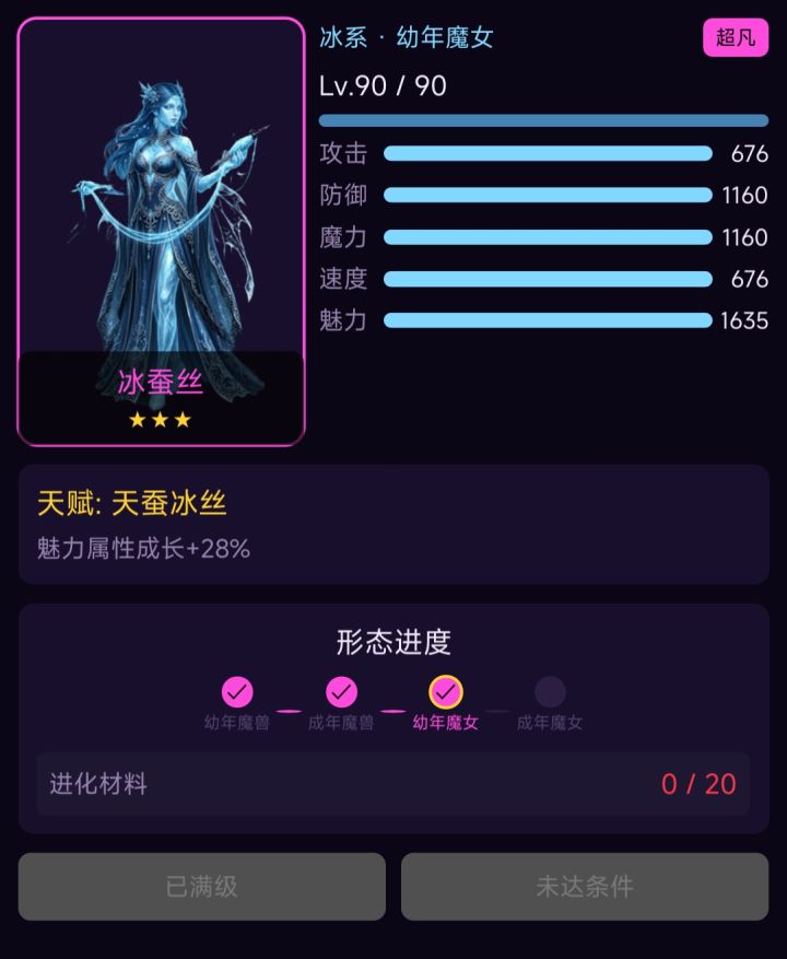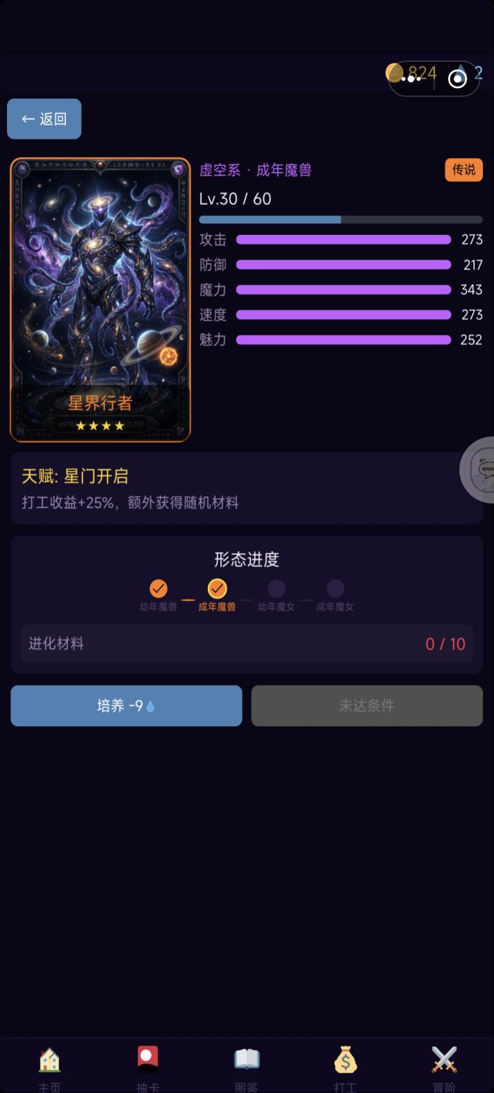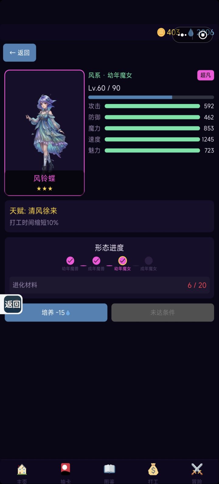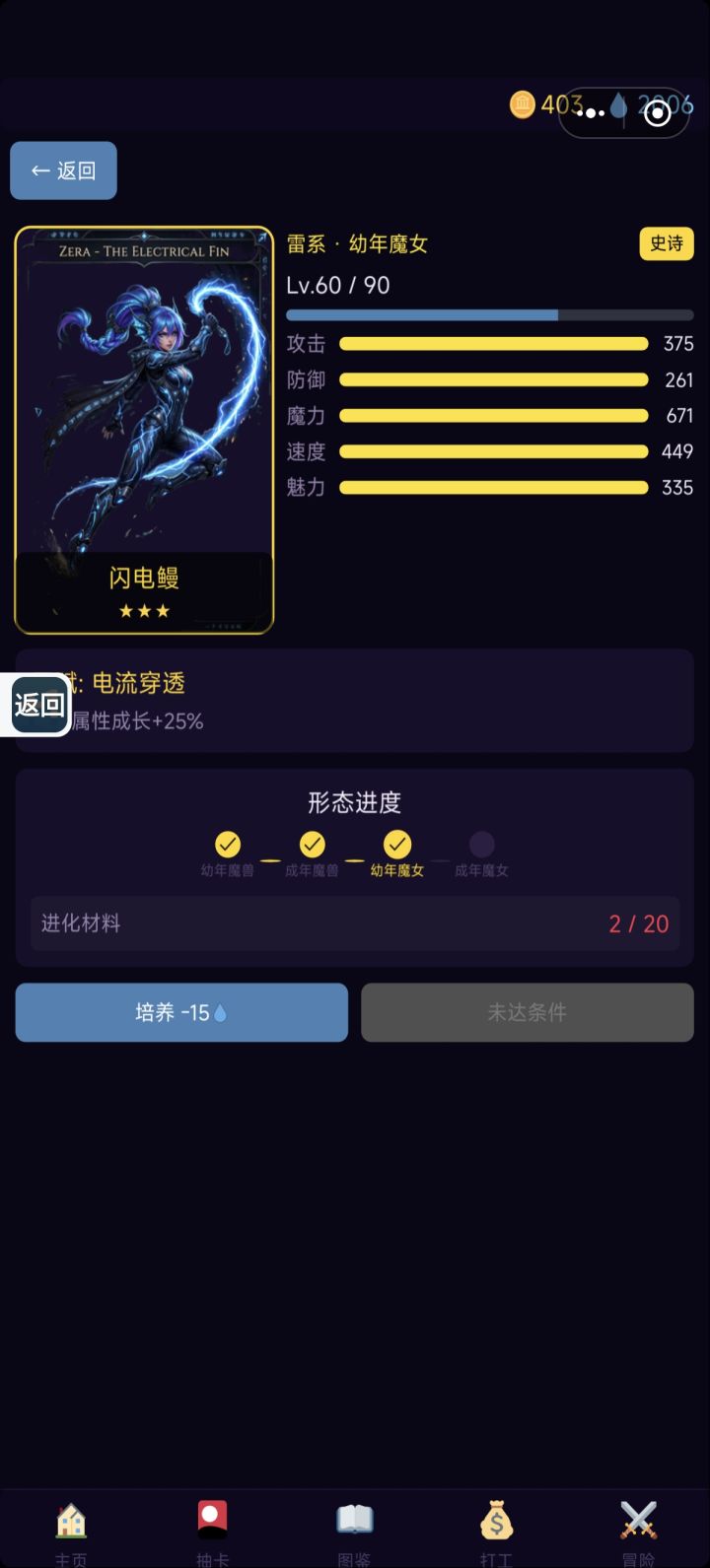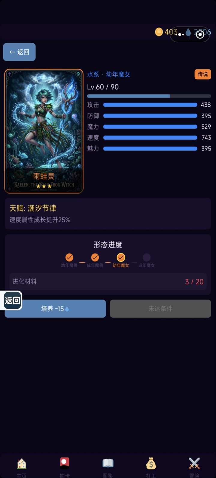 立绘可以放大,满足进化条件的卡可以置顶,省的我挨个点着看。幼年就成女性了。