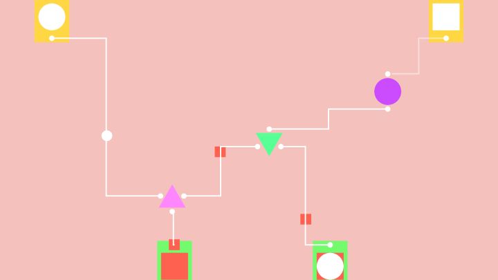 分别分为粉色和青色三角形,还有蓝色和紫色的圆形,这些都各自有它们的功能,我们玩家所需要的就是通过连接不同的三角形和圆形达到绿色管道所需要的图形要求。但是我想吐槽一点是这个粉色,我真的没有想到他真的是粉色hhh,我一开始还以为是紫色,要不是他旁边那个紫色非常的紫,我都没认出来,他是粉色对我来说,它更接近于玫红,或者是品红?(也许也只是为了跟背景的粉色拉开来吧)