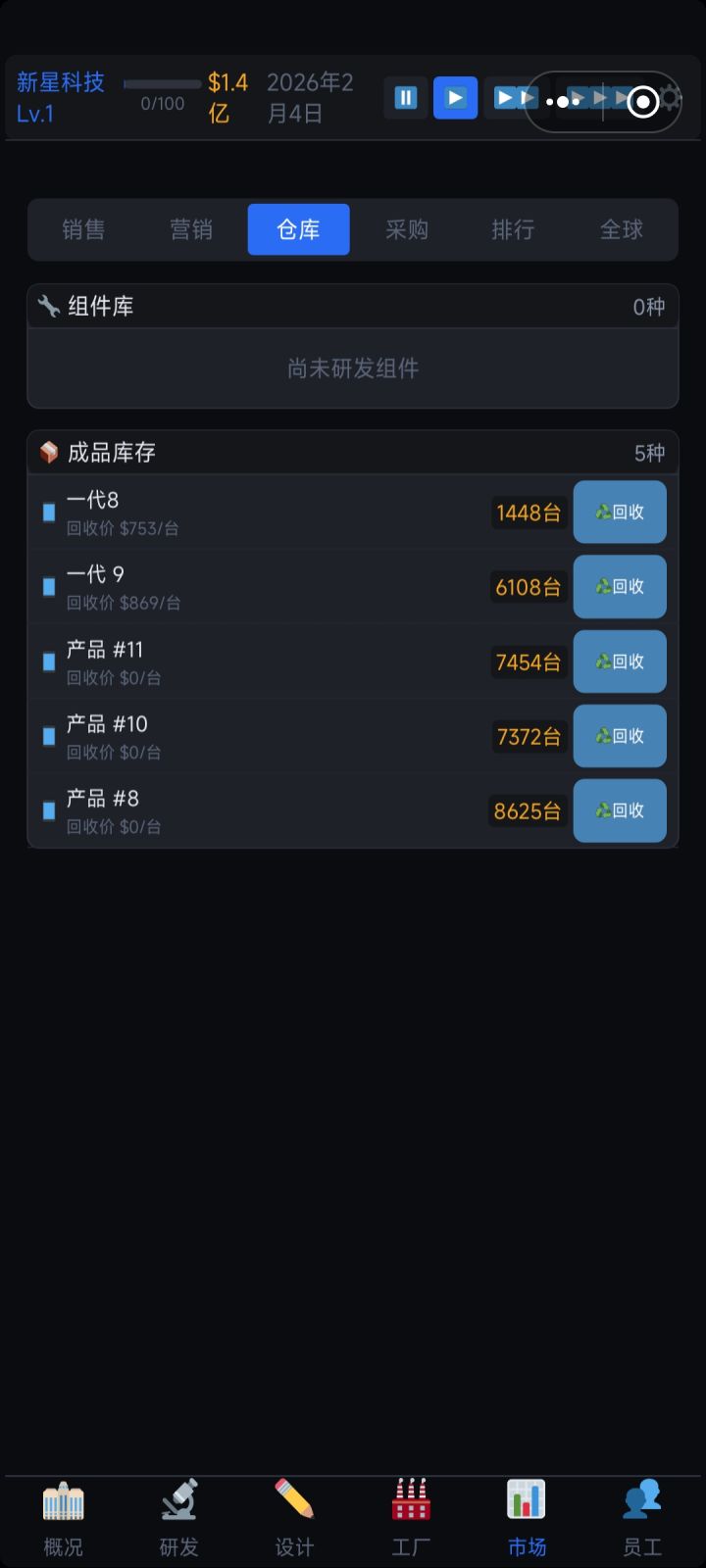 1、新增自动研发功能。2、优化数据结构。3、研发时间与价格递增,初始时间与价格修改。4、优化员工对研发时间加成。5、历史产品显示只显示最近15个,自动清理下架超过24个月的无效记忆,优化卡死问题,防止数据无限增长。6、当3倍速产生数据处理不过来时,自动降为1倍速,留足时间处理数据,防止游戏崩溃。7、优化存档结构,存档损坏时游戏不卡死闪退,并自动修复。
