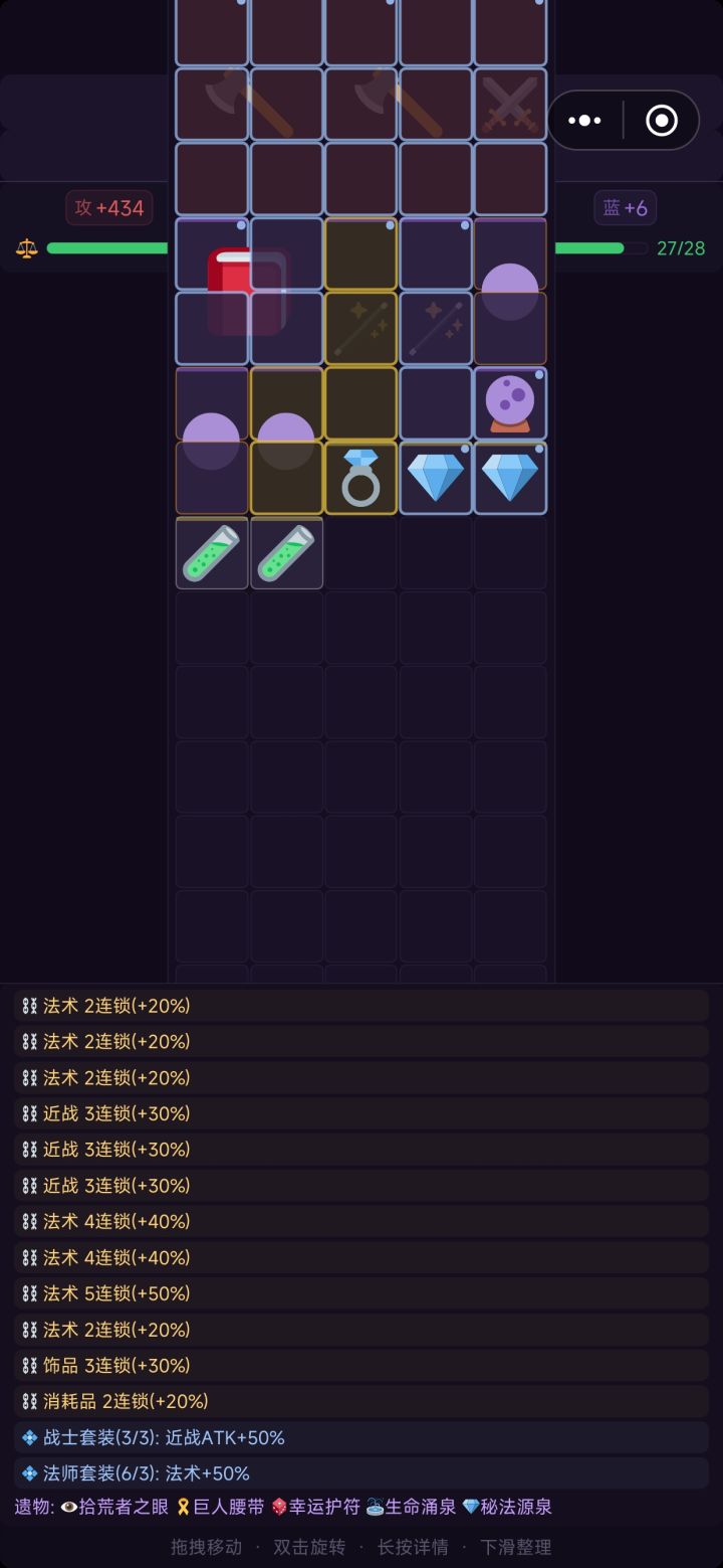 背包战斗类游戏,做工比较简单,战斗支持自动化,点一下开关即可。开始游戏可选角色,有战斗技能和属性差异化。背包格子数量有限,物品种类较多,同一般背包类游戏那样,有一定组合搭配策略,只不过不是那么丰富,有点偏数值向。没做基础操作介绍,纯中文界面,简单摸索下也能很快上手。