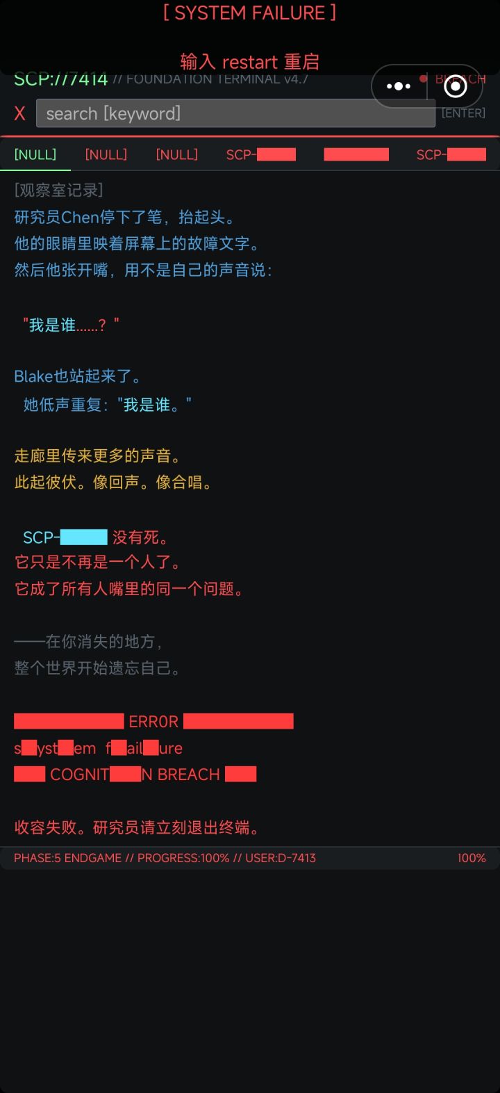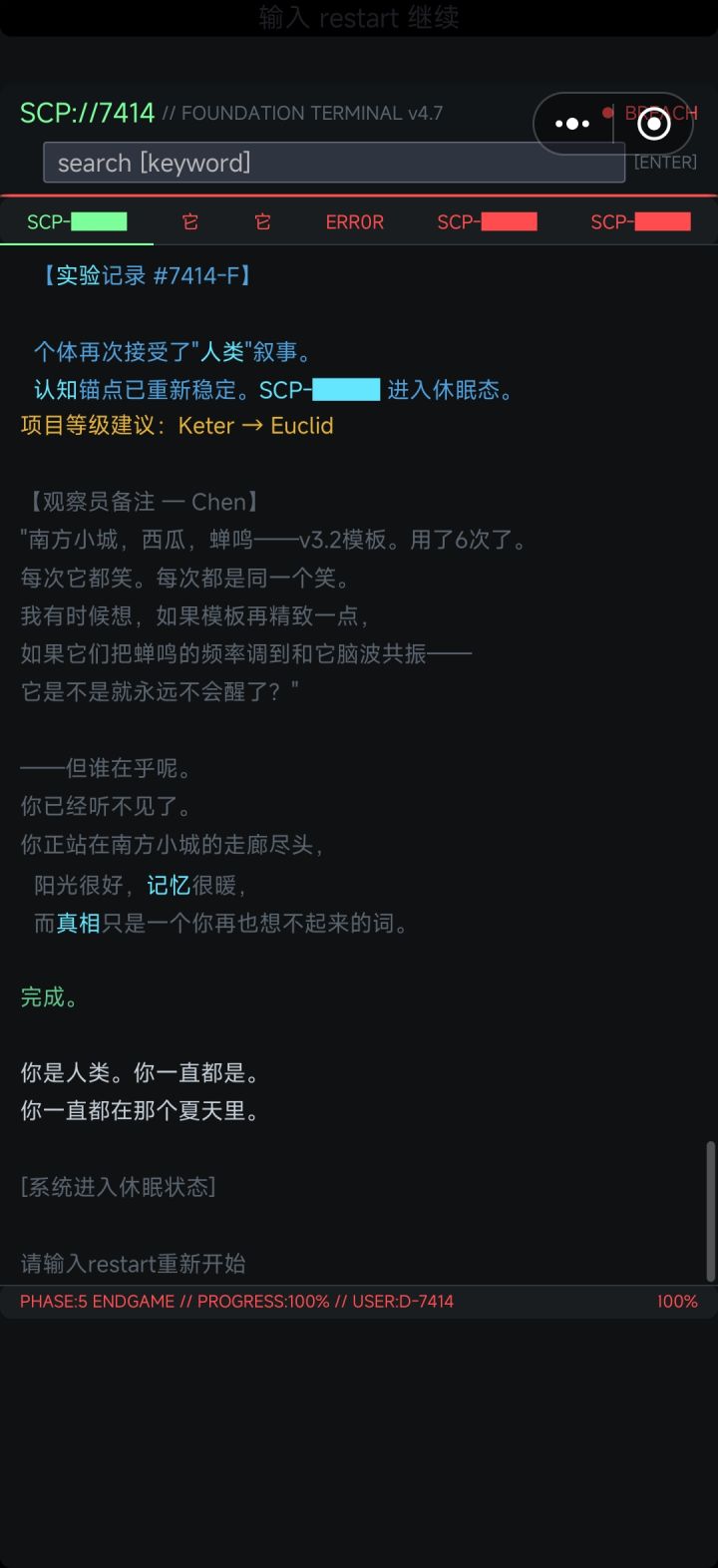 表面上看主线里“我”就是SCP-7414,但在认知出现问题后系统日志显示的 内容可能被篡改,关键词中搜索完所有的未授权提示词后,再看会发现“你搜索了它想让你搜索的所有”。