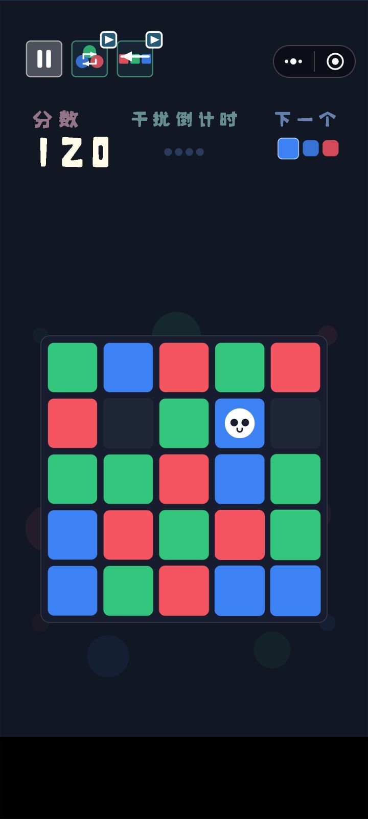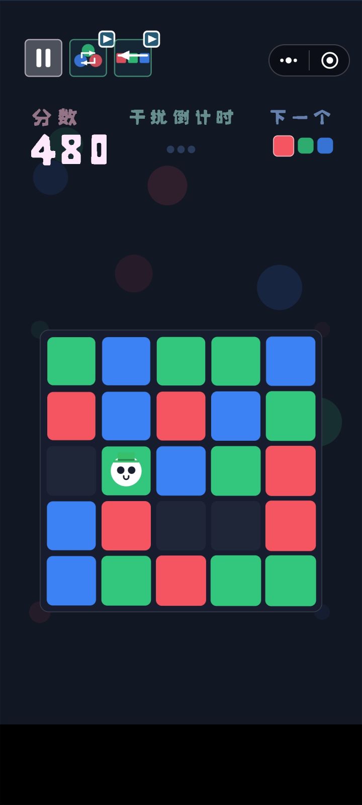 首先,我比较菜,2000分都没达到。基本玩法就是邻格行走,行走的颜色在右上角那个下一个,三个连在一起就消除,广告是无路可走的时候可以两次退3格,左上角的两个广告一个是刷新下一个里面的颜色,一个是退三格,这里吐槽一下左上角的退三格广告不止退格还退分。。。玩法就是这些。